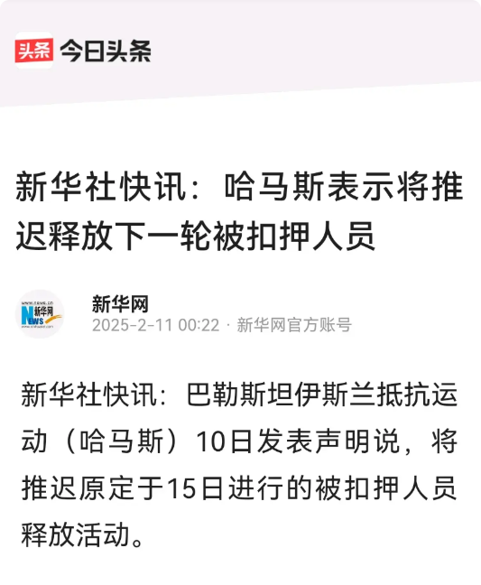 以色列人质被换回,但是憔悴、瘦弱与被绑架之前大相径庭,此样貌引起以色列总统、总理到国民对哈马斯的斥责。正当以色列人满怀激愤时,哈马斯又要推迟释放下一轮被扣押人员。至于推迟的原因,不得而知,可能是自己武装力量被打残了,人质已经找不到或者已经死亡。这样的话哈马斯又将面临以色列的武装打击,看来每次挨打都不是白挨的。