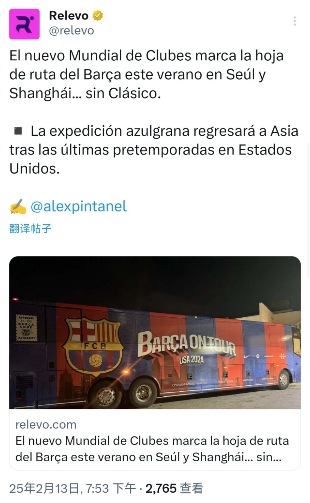 接力:巴萨今夏前往亚洲进行季前赛,最近确认了两个比赛地点,上海和首尔,另一场计划在日本进行,今夏季前赛不会有国家德比。🤔🤔🤔🤔