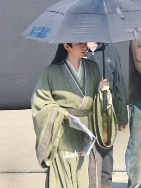 第三套则是草绿色交领常服,头发部分高束,部分披散,整个人斯文儒雅。