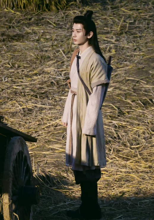 另一套浅灰长衫配深灰外衫,黑色长靴,少年发髻,整个人随意躺在稻草中,自在不羁,凸显角色的自由个性,深得书迷的喜爱。