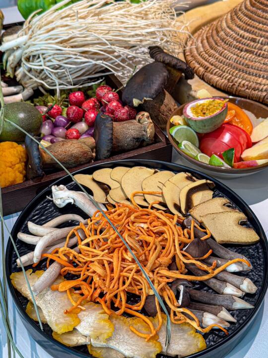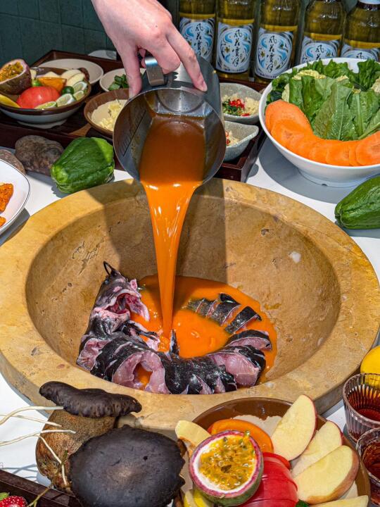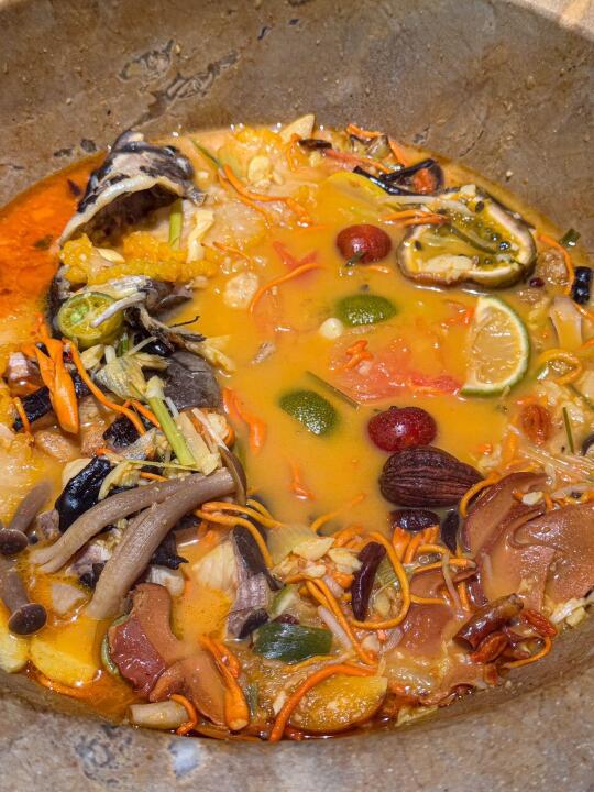 强烈安利他们家的山野果味酸汤锅底,简直是云南味道的完美复刻!里面有西红柿、鲜百香果、青柠檬、独头蒜、山楂、香茅草,还有店内现炒的辣椒和七彩辣椒,满满一锅的丰富食材,光看着就让人垂涎欲滴。