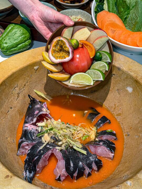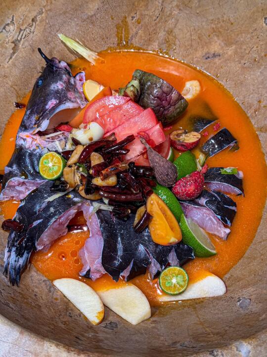 把鱼放进锅里,用高温蒸汽蒸制5分钟,开锅的瞬间,那香气直钻鼻腔。先喝一口汤,微辣微酸的口感,特别开胃。再尝尝鱼肉,汤汁完美地浸透到每一块鱼肉里,鲜嫩无比,一点腥味都没有,细细品味,还带着淡淡的果香,真的是一口接一口,根本停不下来。