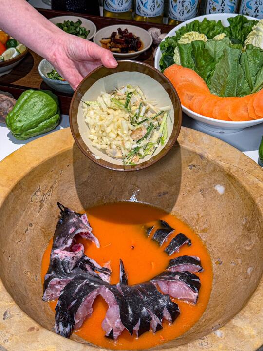 这里都是活鱼现点现捞,都是从基地直供、活水养殖的。超大条的黑清江鱼,捞上来的时候还活蹦乱跳,这新鲜度简直没话说。切花刀的鱼肉看着都晶莹剔透。