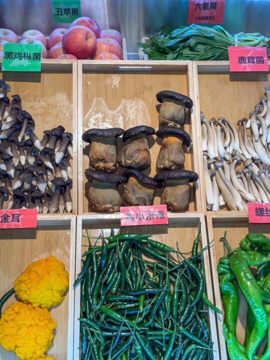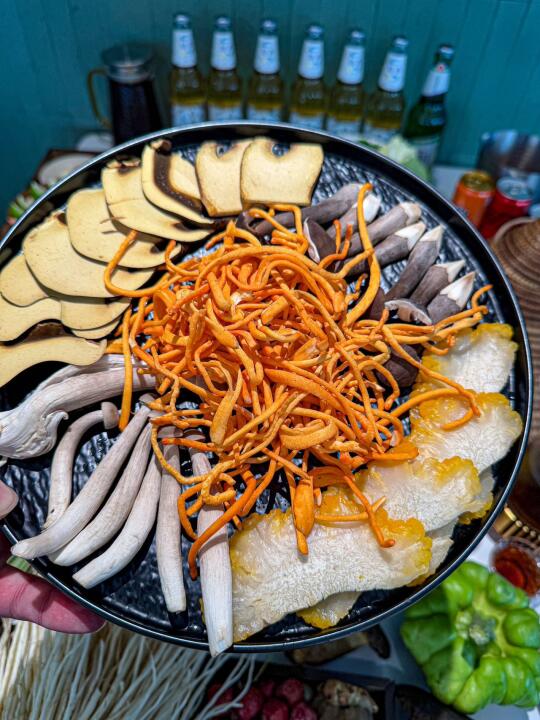 除了石锅鱼,再搭配上洱海菌拼盘和蔬菜拼盘,各种菌菇和新鲜蔬菜吸满了鲜美的汤汁,味道也超赞。