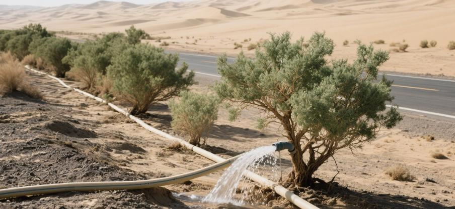 没淡水?就用沙漠里的咸水浇树,照样活!塔里木沙漠公路两边的 2000 万棵树,全靠咸水滴灌,成活率 85% 以上,公路再也不怕被沙子埋了。