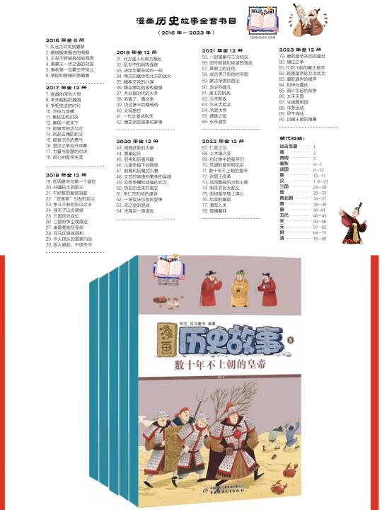 [鼓掌R]《漫画历史故事》全90册,从神话传说到明清末年,历史启蒙一条线。从1到90册,分别是远古至夏(第11⃣册),商(第2⃣册),西周(第3⃣册),春秋(第4-7),战国(第8-12),秦(第13-17),汉(第18-23),三国(第24-28),晋(第29-33),南北朝(第34-37),隋(第38-39),唐(第40-44),五代(第45-49),宋(第50-56),元(第57-63),明(第64-75),清(第76-90)。