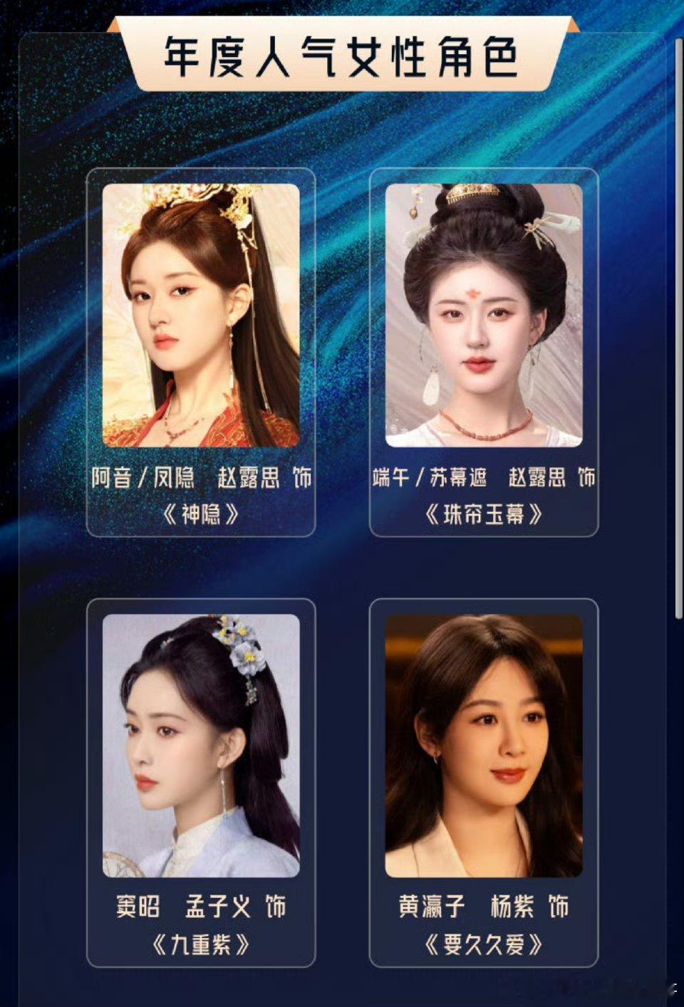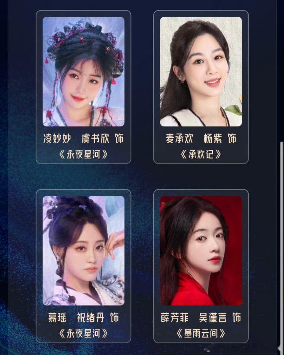 阿音/凤隐《神隐》、端午/苏幕遮《珠帘玉幕》、窦昭《九重紫》、黄瀛子《要久久爱》、凌妙妙《永夜星河》、麦承欢《承欢记》、慕瑶《永夜星河》、薛芳菲《墨雨云间》、小夭/玟小六《长相思第二季》、杨采薇/上官芷《花间令》