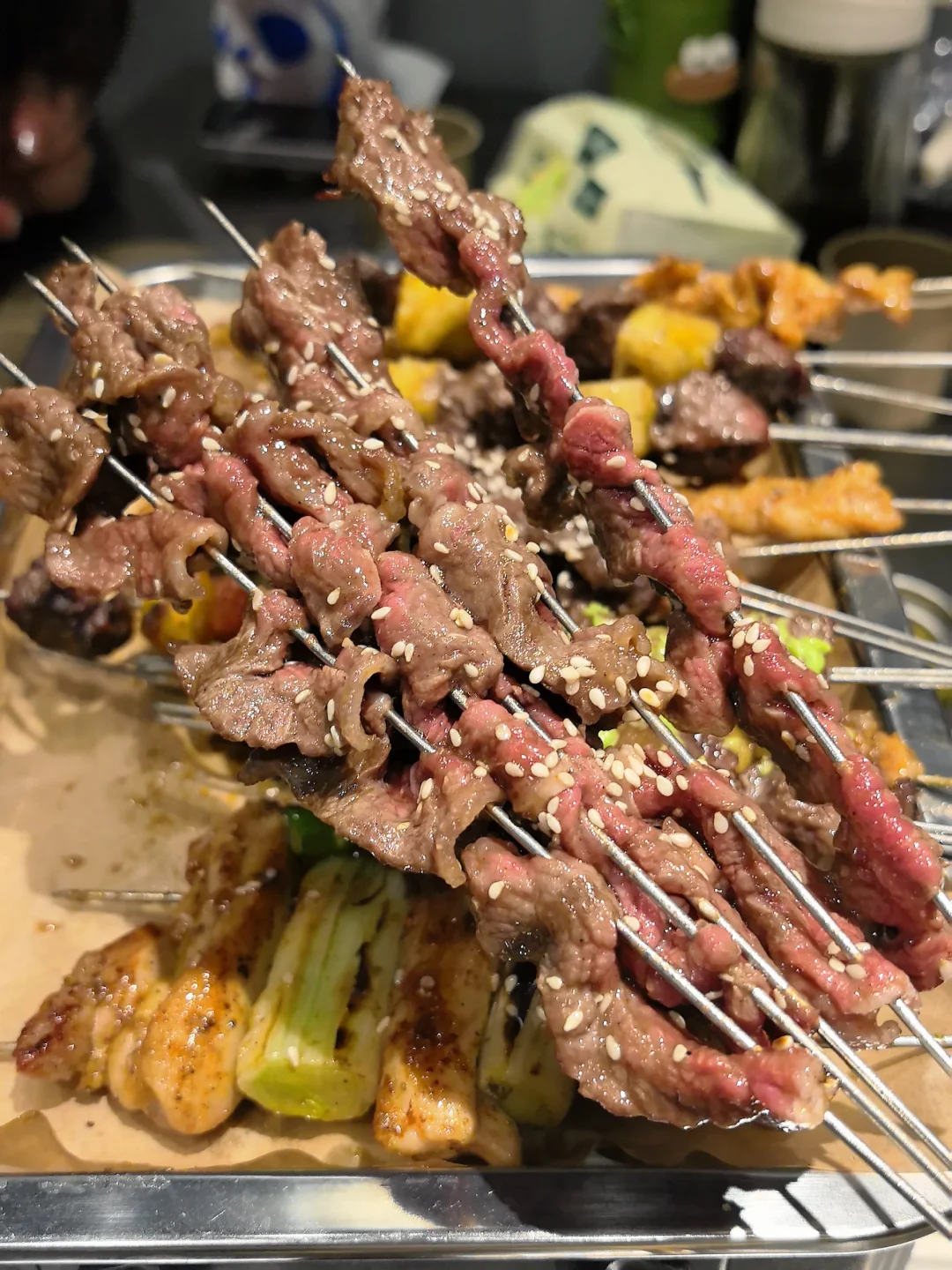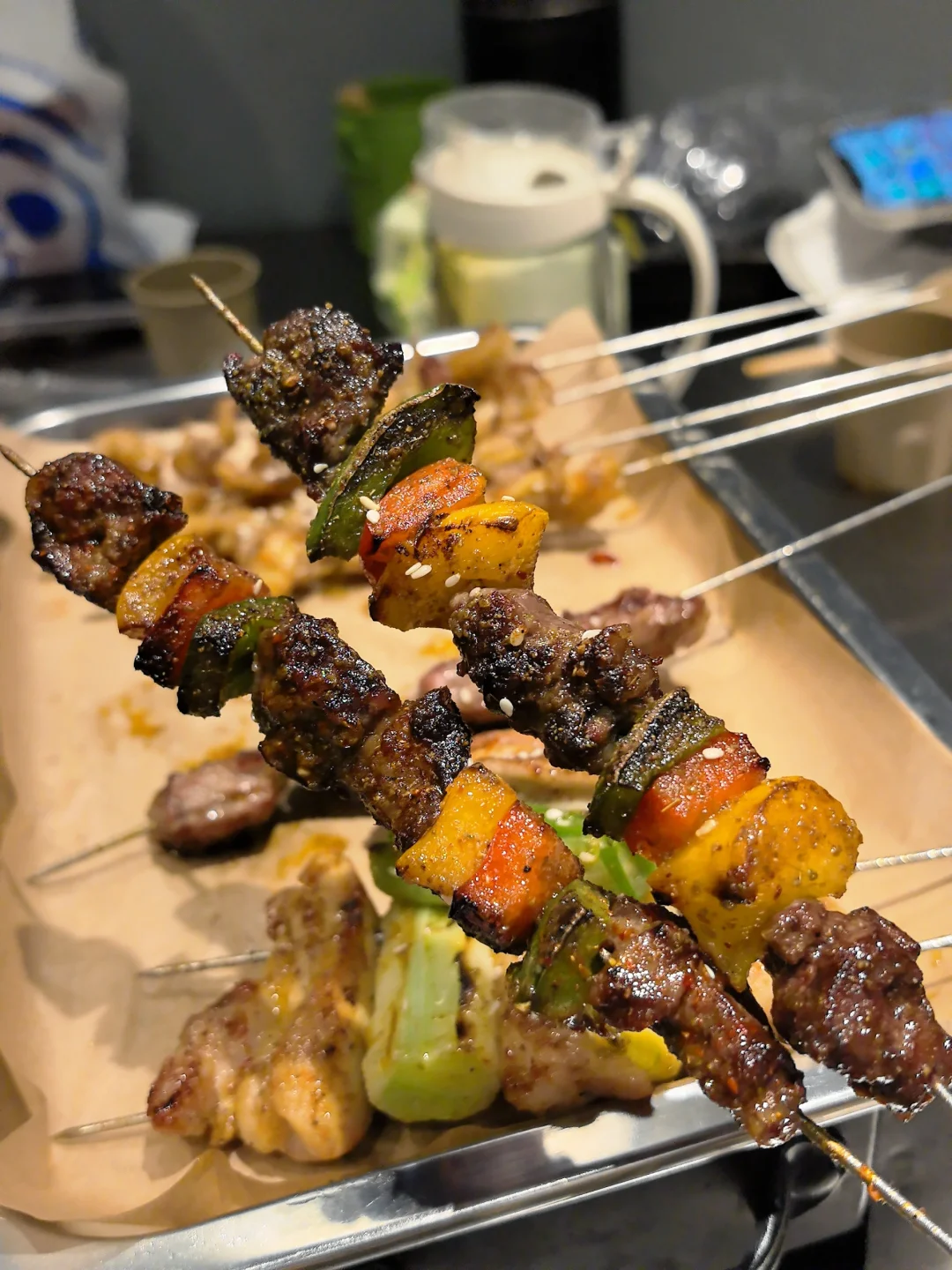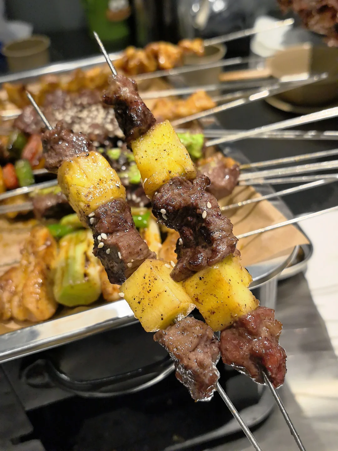 刚开业就喜欢上的一家烧烤店 最近又出了好多new🍢 店里的妹妹还是那么会推荐 二刷点的zui惊艳的是鸡腿肉和胸口油 ✔鸡腿肉饱满大串,鸡肉嫩滑多汁 ✔胸口油脆脆的,可以连吃两串 ✔水果系列的还是凤梨🍍更合我心意 彩椒的也不错吃! ✔还出了一把点的嫩吊龙,七分熟超绝 🥰感觉是会去好多好多次的小店