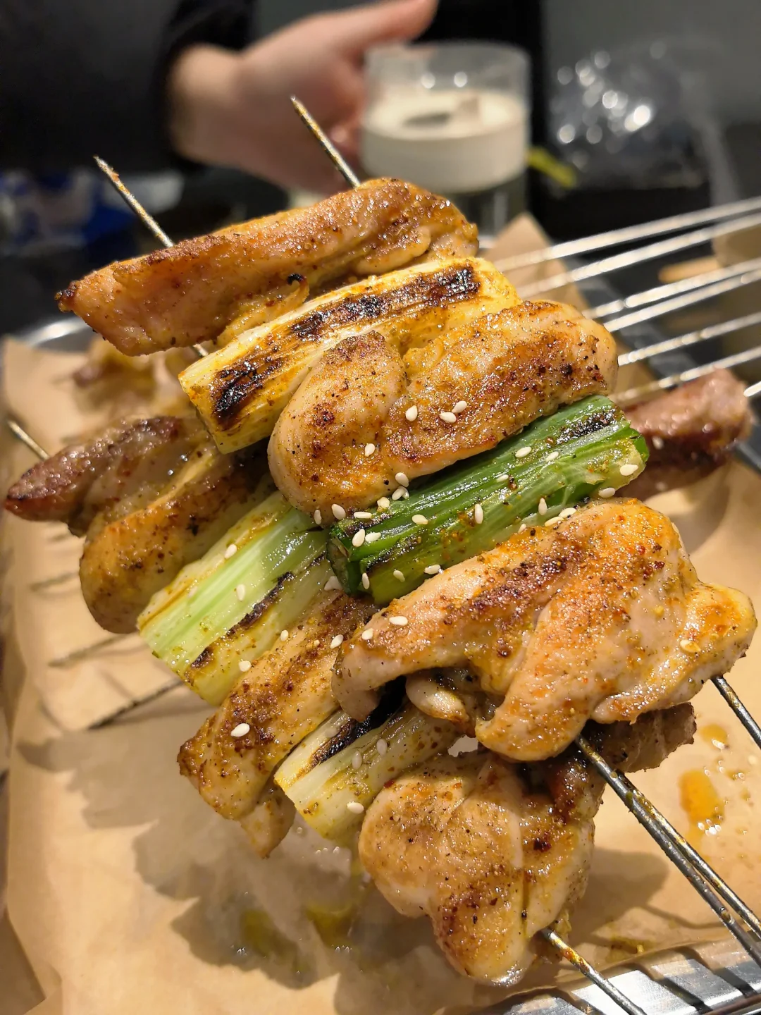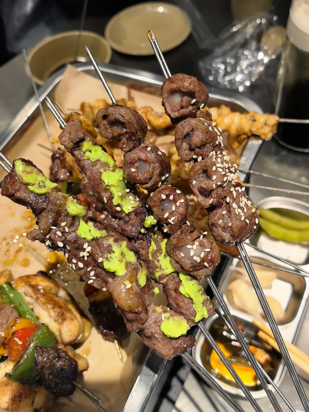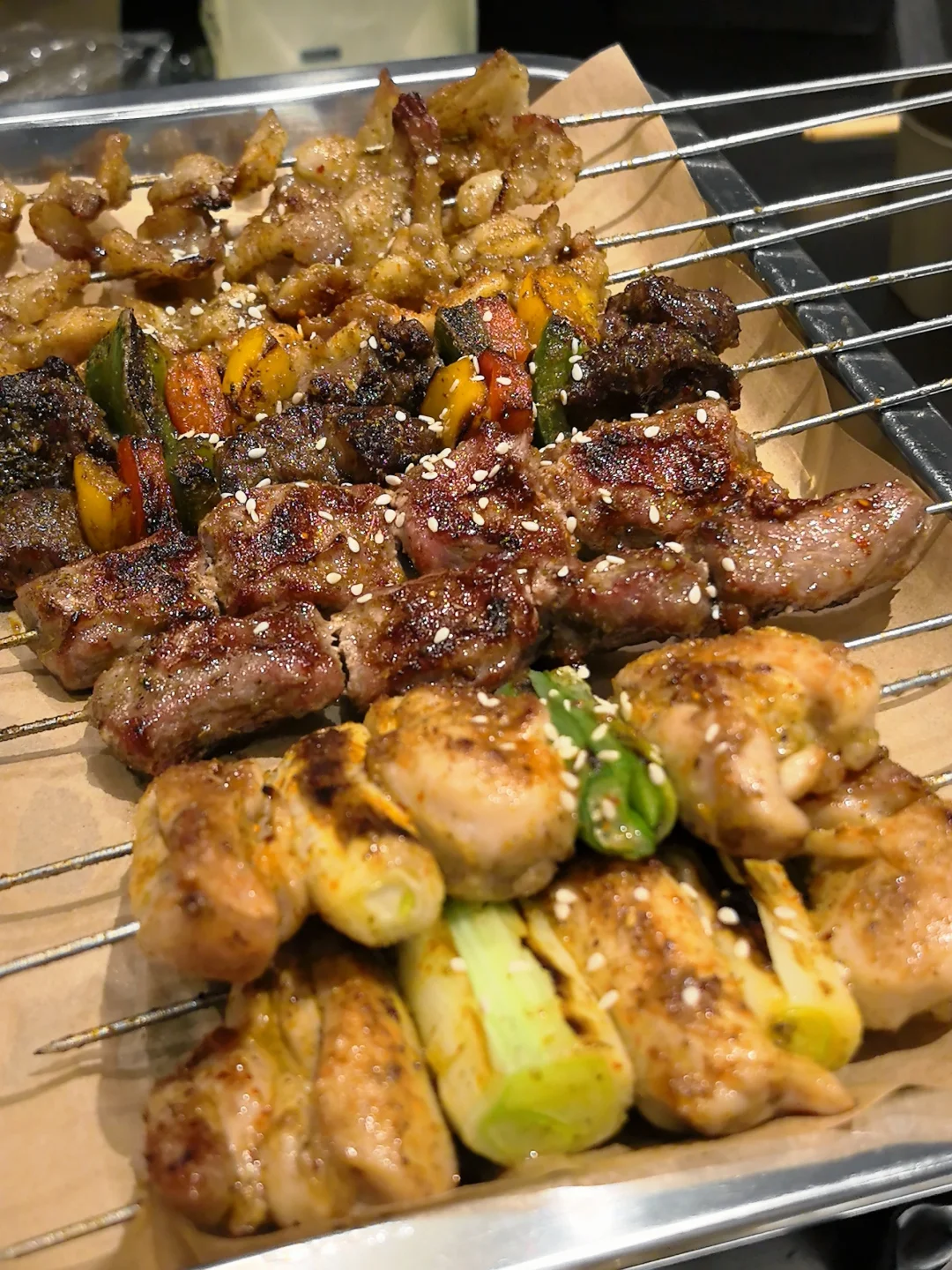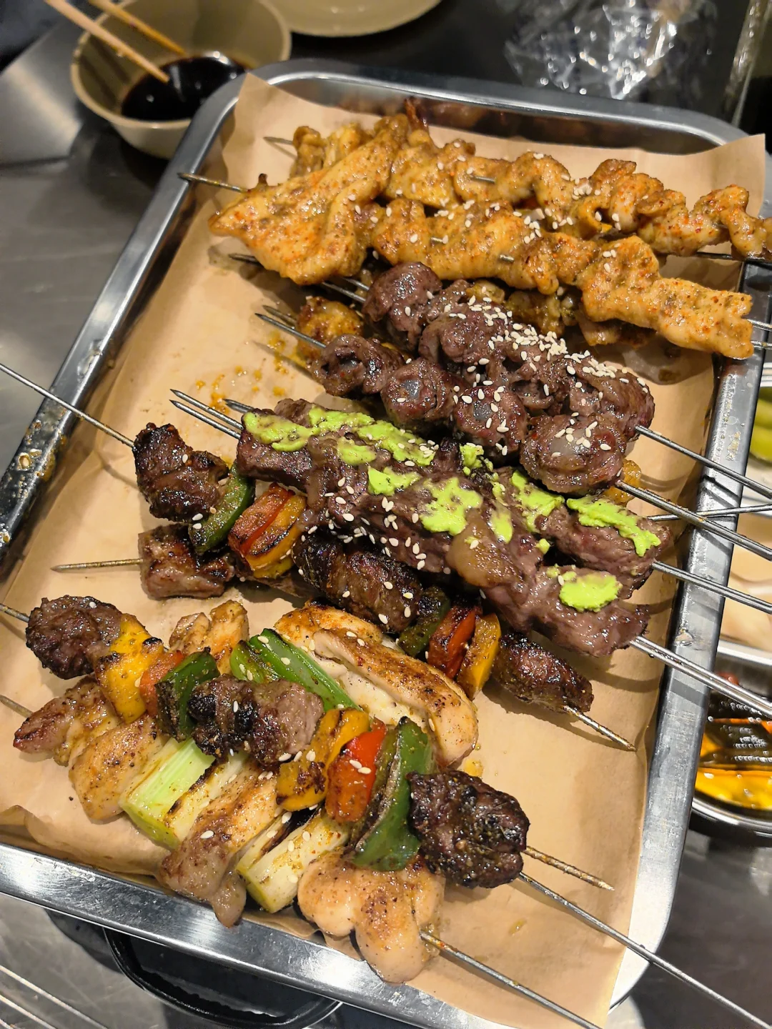 刚开业就喜欢上的一家烧烤店 最近又出了好多new🍢 店里的妹妹还是那么会推荐 二刷点的zui惊艳的是鸡腿肉和胸口油 ✔鸡腿肉饱满大串,鸡肉嫩滑多汁 ✔胸口油脆脆的,可以连吃两串 ✔水果系列的还是凤梨🍍更合我心意 彩椒的也不错吃! ✔还出了一把点的嫩吊龙,七分熟超绝 🥰感觉是会去好多好多次的小店