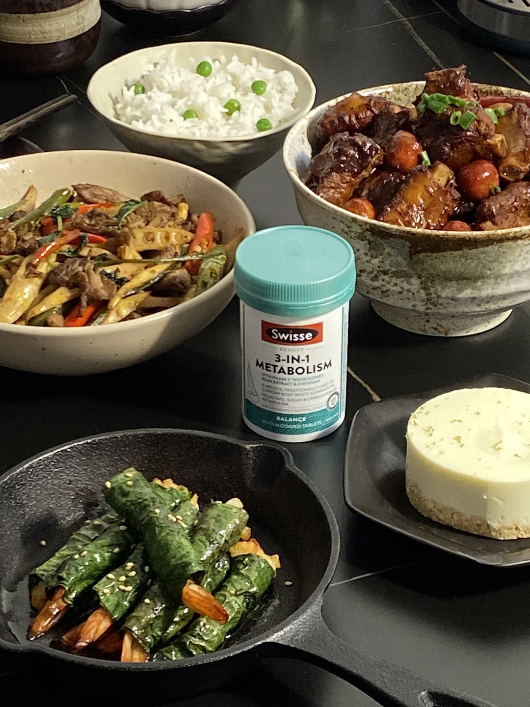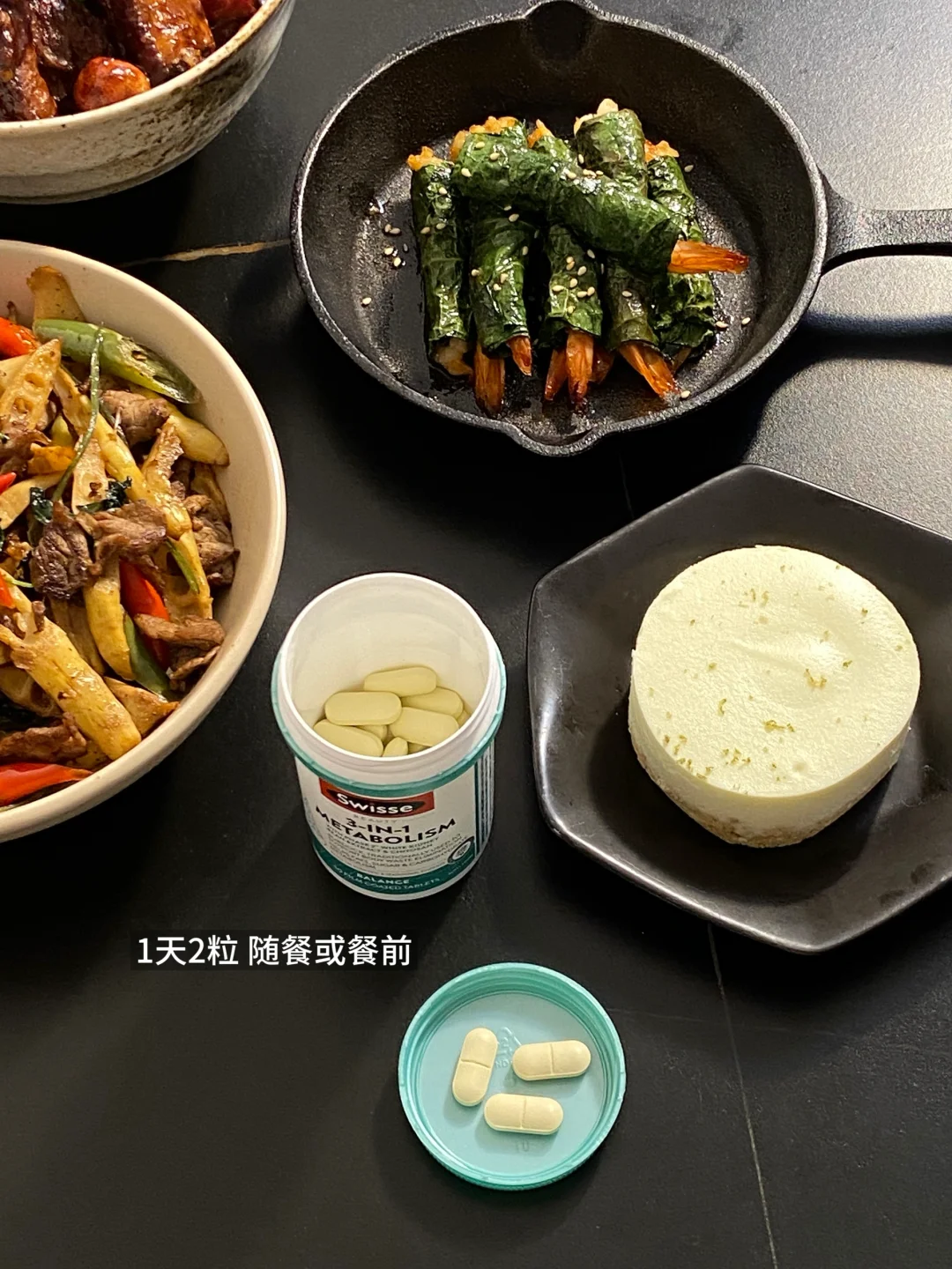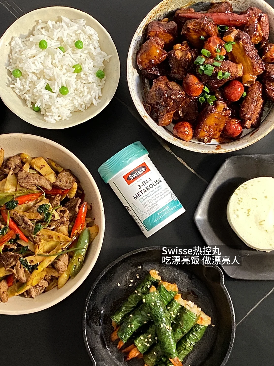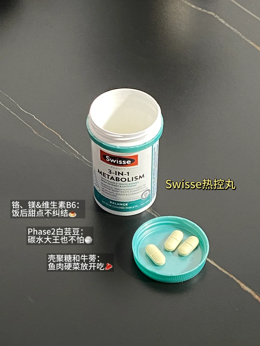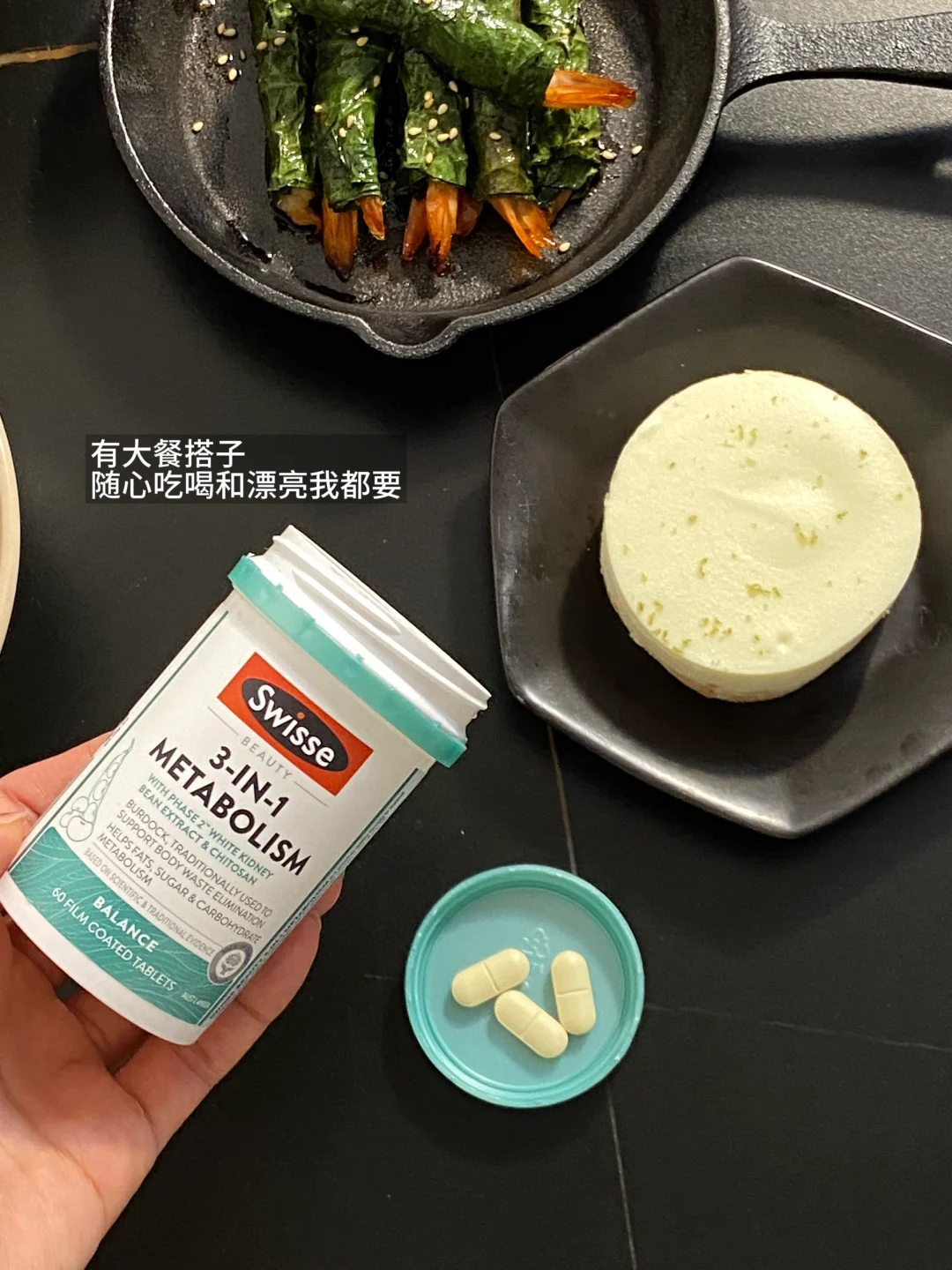 不过今天我有好帮手,随餐来两颗Swisse热控丸,让我可以放心大胆地享受美味饭菜。加入了铬、镁&维生素B6,饭后甜点不纠结;Phase2白芸豆,碳水大王也不怕;同时还有壳聚糖和牛蒡,调节新陈代谢,鱼肉硬菜放开吃!想show就show,有了美食搭子,畅吃漂亮饭!