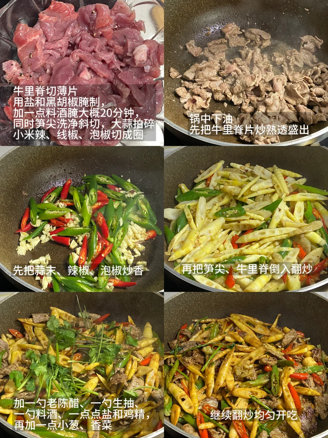 2)锅中下油,先把牛里脊片炒熟透盛出,用余油继续,先把蒜末、辣椒、泡椒炒香,再把笋尖、牛里脊倒入翻炒,加一勺老陈醋、一勺生抽、一勺料酒、一点点盐和鸡精,再加一点小葱、香菜,继续翻炒均匀开吃