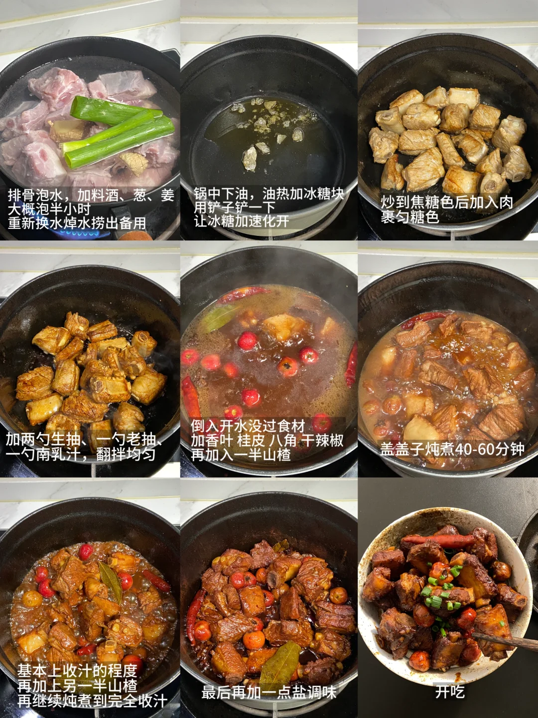 肋排两条|山楂|葱|姜|香叶|桂皮|八角|干辣椒|生抽|老抽|冰糖