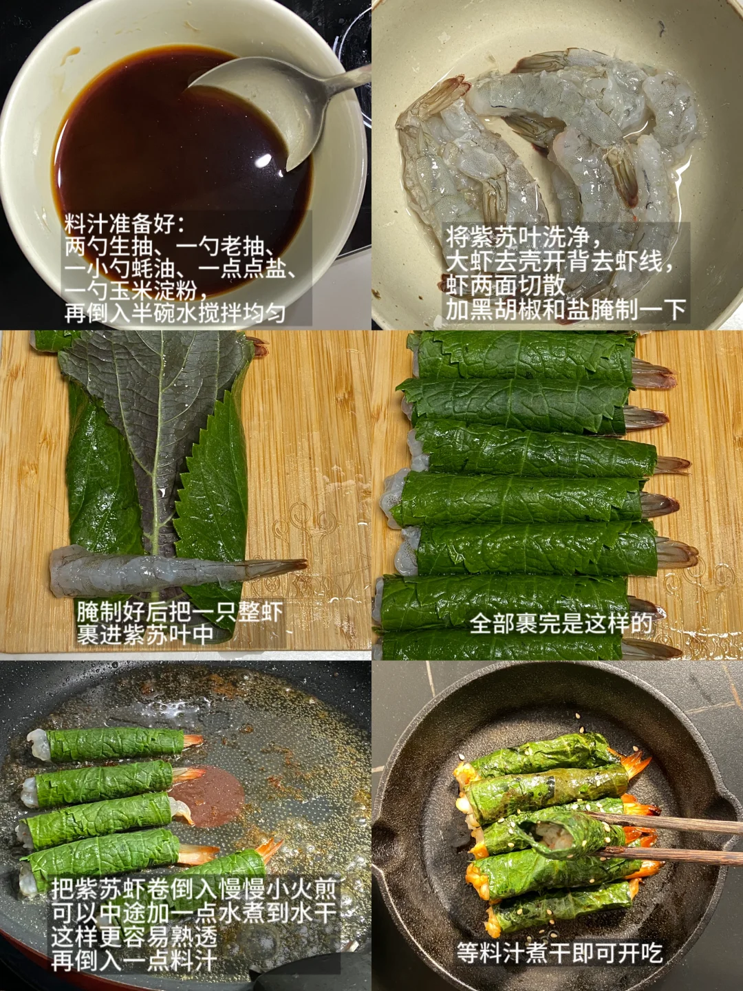 3)锅中下油,把紫苏虾卷倒入慢慢小火煎,可以中途加一点水一起煮到水干,这样更容易熟透,再倒入一点料汁,等料汁煮干即可开吃
