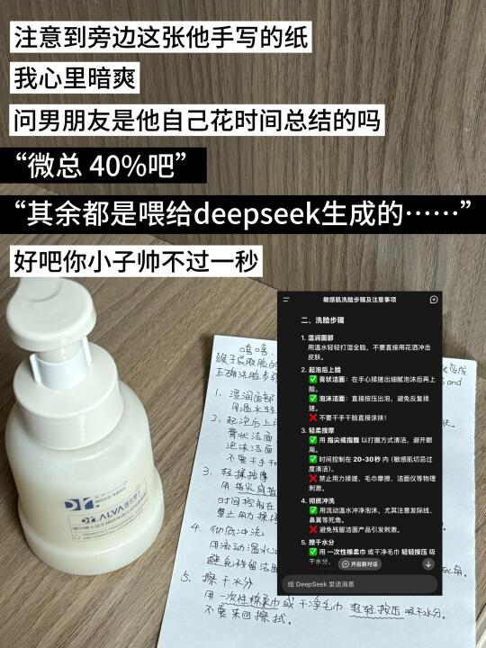 一些和男朋友的搞笑和心动时刻~ 这里必须狠狠夸他一波 看到我的脸最近因为换季敏感变成猴子脸 主动寻求deepseek老师的帮助 反复挑选后给我入手了温和型的瑷尔博士胖fufu洁面慕斯!