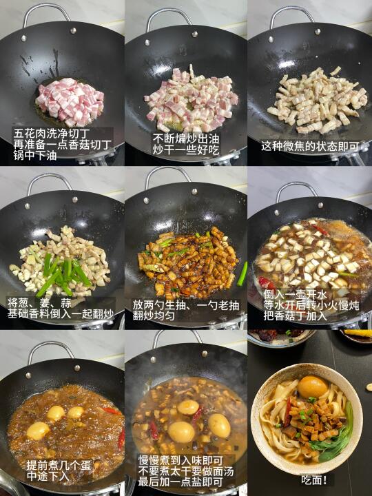 五花肉切丁|鸡蛋|香叶|桂皮|八角|葱|姜|蒜|干辣椒|香菇