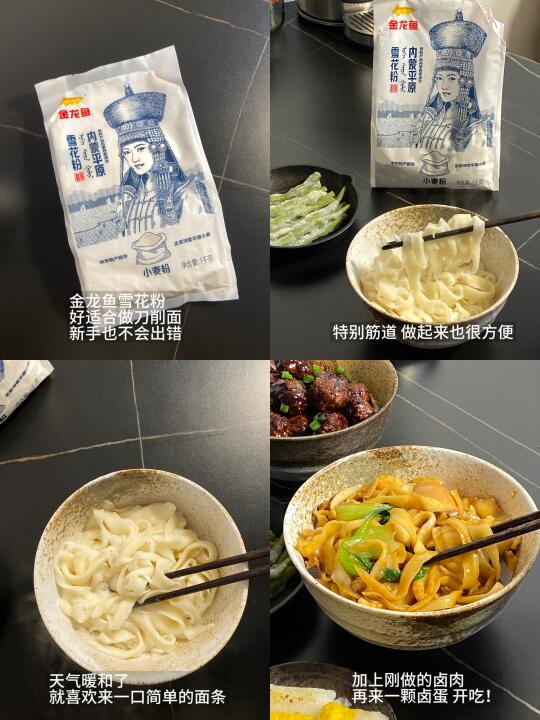 今天用的雪花粉是最适合做面条的一种小麦粉,特意买的金龙鱼内蒙平原雪花粉,优中择优的内蒙平原小麦,选取麦芯精华部分,多道工序研磨出细腻的粉质,面粉的吸水性确实很好,揉面的时候就觉得揉起来很筋道,做刀削面就是需要更有弹性筋道有劲儿的面,用这样的面粉做出来的面很满意!