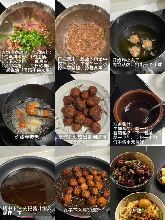 5)另起锅下油,先把酱汁倒入搅拌到浓稠,再把小丸子倒入裹匀即可