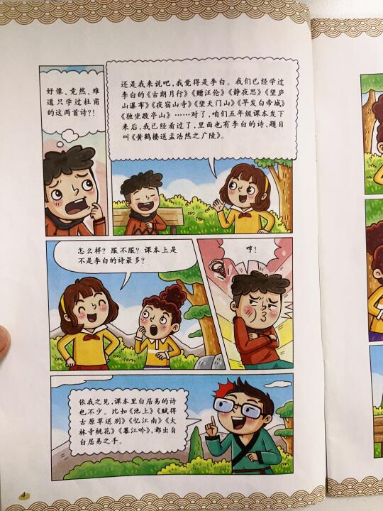 • 故事引入:通过生动的故事场景,引入古诗词名句,讲解诗人的创作背景,让娃儿在轻松愉快的氛围中学习。学古诗词不单单停留在背诵,而是学透,考试会运用,这才是这套《漫画古诗词》的独特之处!