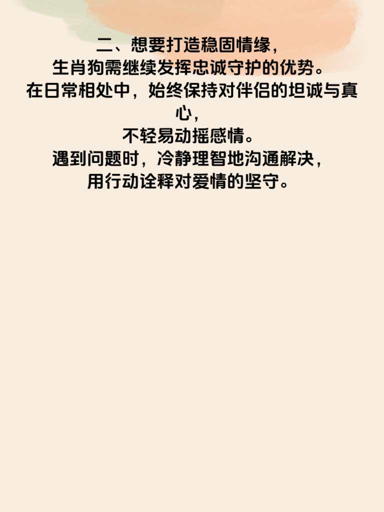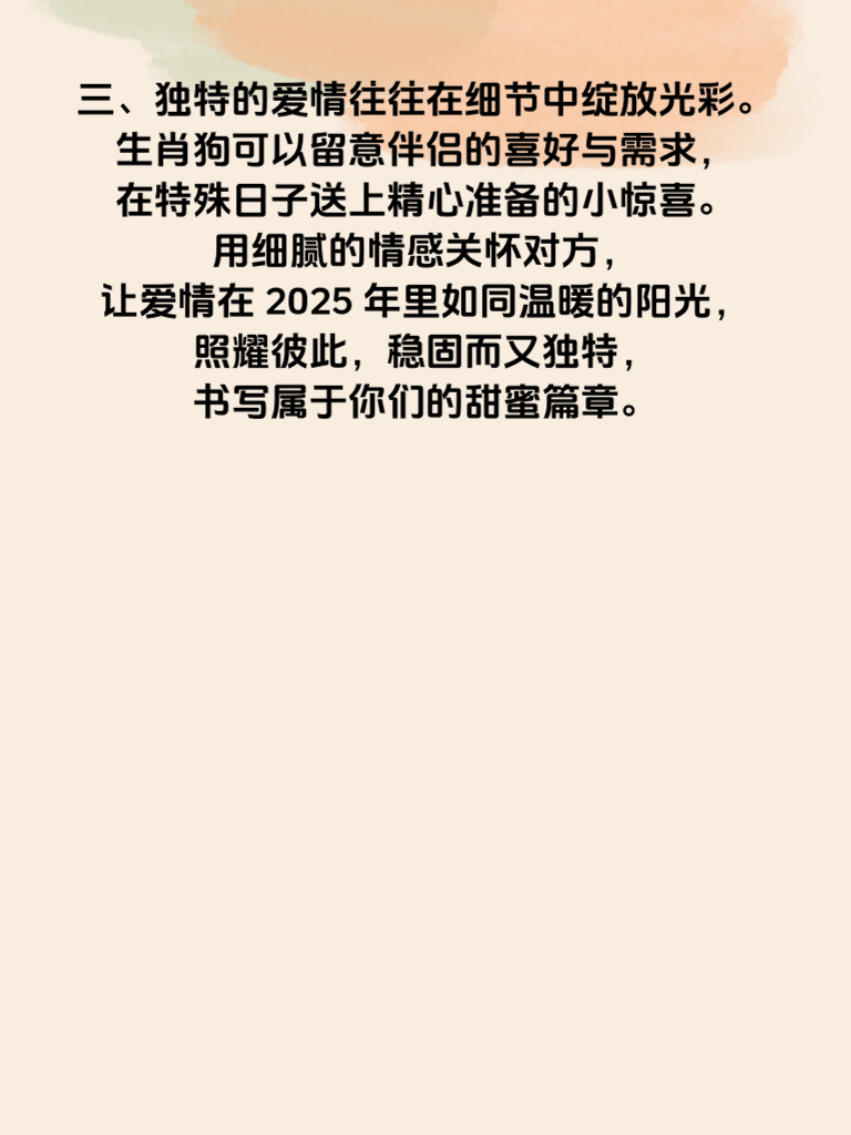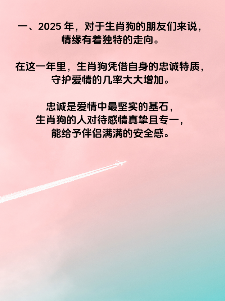 一、2025年,对于生肖狗的朋友们来说,情缘有着独特的走向。在这一年里,生肖狗凭借自身的忠诚特质,守护爱情的几率大大增加。忠诚是爱情中最坚实的基石,生肖狗的人对待感情真挚且专一,能给予伴侣满满的安全感。 二、想要打造稳固情缘,生肖狗需继续发挥忠诚守护的优势。在日常相处中,始终保持对伴侣的坦诚与真心,不轻易动摇感情。遇到问题时,冷静理智地沟通解决,用行动诠释对爱情的坚守。 三、独特的爱情往往在细节中绽放光彩。生肖狗可以留意伴侣的喜好与需求,在特殊日子送上精心准备的小惊喜。用细腻的情感关怀对方,让爱情在2025年里如同温暖的阳光,照耀彼此,稳固而又独特,书写属于你们的甜蜜篇章。