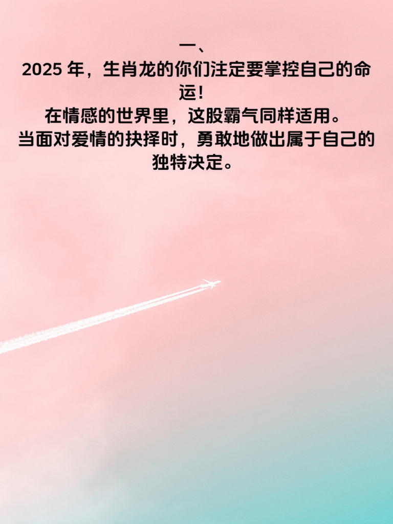 一、2025 年,生肖龙的你们注定要掌控自己的命运!在情感的世界里,这股霸气同样适用。当面对爱情的抉择时,勇敢地做出属于自己的独特决定。 二、不要害怕去追求心中所爱,生肖龙的你们有着无限的魅力和勇气。大胆地展现自己,让那个特别的人看到你的闪光点。 三、在打造独特人生的道路上,爱情也是重要的一部分。凭借你们的智慧和果断,抓住每一个与爱情相遇的机会,书写属于自己的浪漫故事。 四、相信自己的直觉,如同生肖龙对命运的掌控般坚定。在情感中做出霸气抉择,创造出独一无二的爱情旅程,迎接美好的 2025 年。