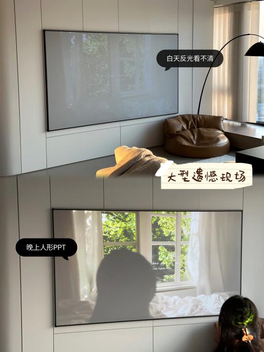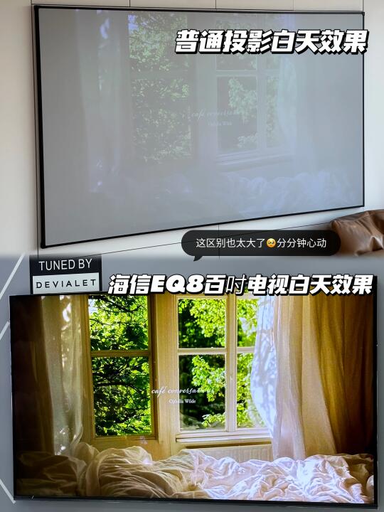 Hello~我是安年,超多姐妹喜欢我的山景房,觉得精致又舒服,但其实我也有“意难平” 当初为极简⻛设计的投影幕布,结果—— ❌ 白天⻛景VS夜晚幕布,落差感拉满! ❌ 投影光线刺眼,家属路过秒变“人影PPT”... 刷到越来越多装百吋电视,本投影党彻底破防! 都说开间2米别买大电视?我偏不信邪! “能力范围内买最大,爽就完事了!” 必须去寻觅我的百寸梦中情机😎 ... ⚡ 去京东⻔店逛一下被画质暴击了... 「这厚度,这画质,是真实存在的吗?」 对比糊成⻢赛克的投影,EQ8的黑曜屏Ultra直接封神!现场都是光但电视画面依旧完整如画,无反光无背影,播放⻛景像是哆啦A梦的传送⻔,太沉浸了!简直是我理想电视! 🔦 还尝试手电筒测试光晕?普通电视光晕能打碟,它居然几乎隐形?! 🎵 帝瓦雷音响真让我身临其境,戴上眼罩直接在脑海里根据声音浮现画面。这音画双绝,投影仪不得当场退役! 👍 还有超火的Deepseek,这电视直接就能用! 现场体验超惊喜,随便问,小到明天的天气,大到出个旅游攻略,简直无所不知! 🎮 以及「330Hz高刷」 原本我对这没什么概念,直到体验了下黑神话悟空游戏,画面真的特细腻丝滑,不晕不卡,小细节都看的很清楚 总而言之 🤩 100寸电视真完美,虽然都是大屏,和投影仪完全是两个世界!!!这款海信e8q我真的想买了 📝 视听享受 投影仪:白天简直不能看 ,音响还有杂音 EQ8:超绝画质无反光,音质更是震撼🌟🌟🌟🌟🌟 📝 智能交互 投影仪:聊胜于无 EQ8:当今最强的AI智能体 🌟 🌟 🌟 🌟 🌟 🔥现在上京东下单还限量送5999元的三色激光投影 ✅送一年影视会员年卡,免安装,6期免息 ✅叠国补至高再省2K (太多福利大家自己去看吧) ✅除了百寸电视,搜【闪电新品季】还有其他独家首发新品,全部买一件送全年,国贴折上折,大家不要错过啦! ... 🤔 我才反应过来原本的装修误区「电视不仅是一个普通的家电,更是生活质感的开关✨ 」 从笨重大背投 到百吋纤薄屏,科技正在重塑家的温度