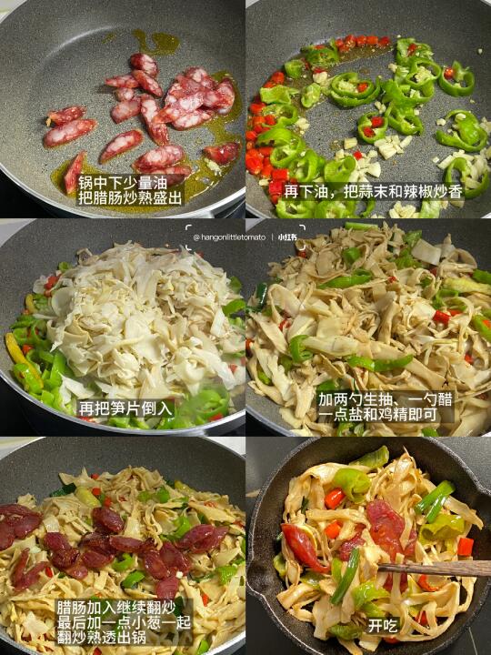 1)用的是笋片,如果是鲜笋要提前焯一下水去涩,锅中下少量油,把腊肠炒熟盛出