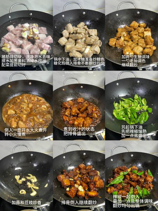 1)猪肋排切块,洗净泡水去味,换水加葱姜料酒焯水捞出,配菜提前切好
