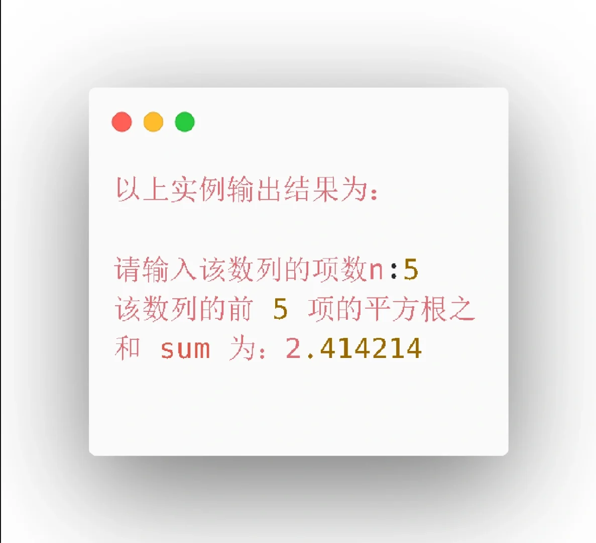 计算并输出该数列的前 n 项(n≥4)的平方根之和sum。