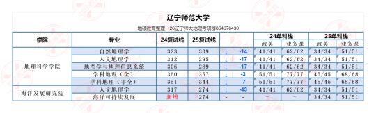 辽师大地理学学硕去年调整了参考书,自然人文分别新增了遥感和地信内容的考查,在一定程度上影响了同学们的备考,再加上公共课偏难,整体的分数下降是可以理解的;而学科地理则是去年的热度不高,加之专业课只考查中国地理,就又吸引了部分同学的报考。海洋研究院的人文热度又有一些下降,同时还有新增专业,相对来说复试线就要比地科院低。