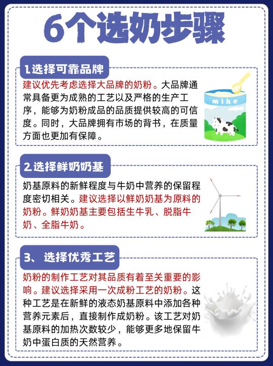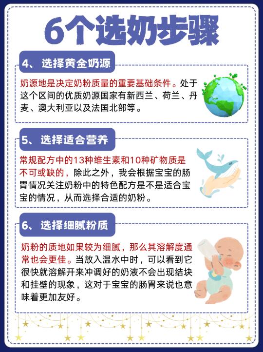 新手爸妈们选口粮是不是很头疼? 别担心!记住这6个选奶小窍门: 挑可靠品牌,选鲜奶奶基,关注优秀工艺,认准黄金奶源,适配宝宝营养,留意细腻粉质。同时,根据宝宝不同体质精准选口粮,体质偏弱一乳铁蛋白等,体型瘦小一胆碱等,敏敏不适避开敏敏源,肚肚偏弱选含天然乳脂因子等成分的口粮。 祥细内容在图,希望能给新手妈妈们带来帮助哦