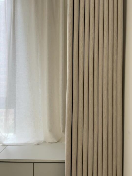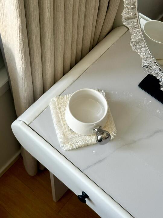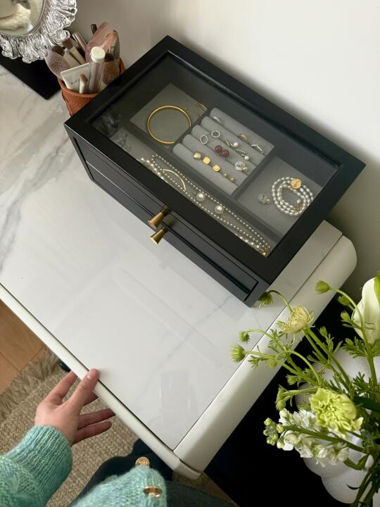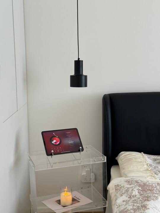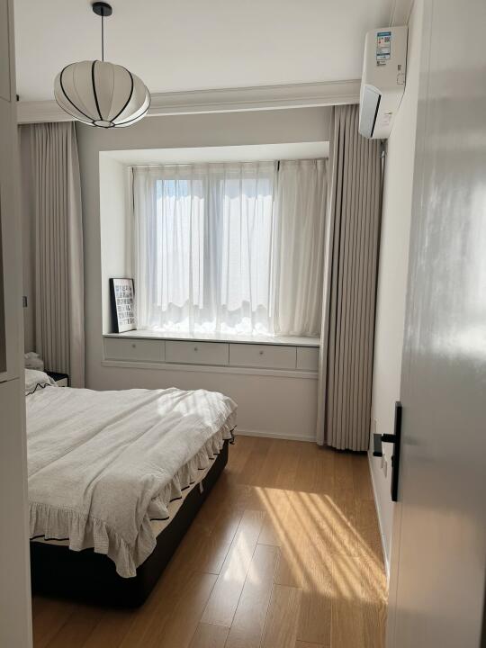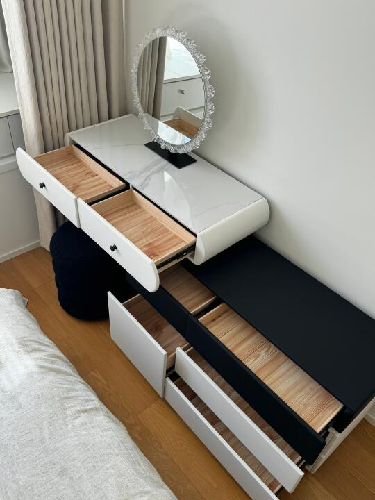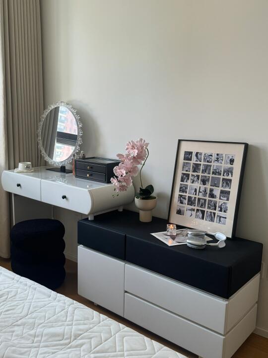床尾90cm真的可以拥有梳妆台 飘窗到门的距离有240cm - 放了一个组合100×100cm的斗柜是完全👌 梳妆台深度40cm 还剩50过道 来回走路也ok 还多了很多储物空间 🗄️ 黑白配色比较百搭~后期配什么软装都可以👌