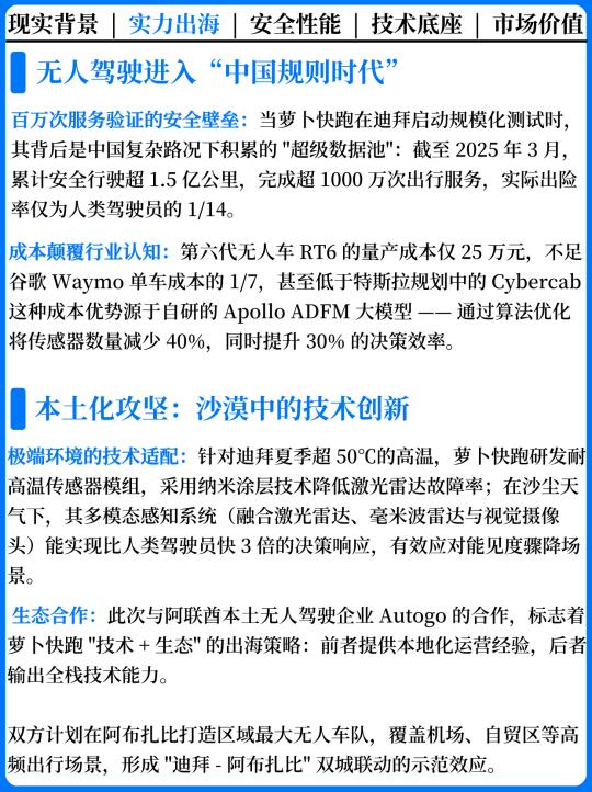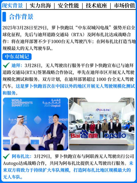 [向右R] 2025年3月28日至29日,萝卜快跑以“中东双城闪电战”强势开启全球化征程,先后与迪拜道路交通局(RTA)及阿布扎比达成战略合作:将在迪拜部署不少于1000台无人驾驶汽车;在阿布扎比打造当地规模最大的无人驾驶车队。