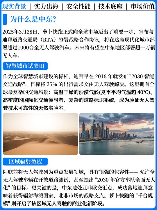 [斜眼R] 阿联酋作为中东经济中心,不仅有7个酋长国,还辐射海湾六国及北非市场,这些地区幅员辽阔,人口众多,交通需求巨大。如果萝卜快跑在当地布局超10000辆无人车,将为中东地区的交通出行带来革命性的变化,为这些地区提供高效、便捷的交通解决方案。