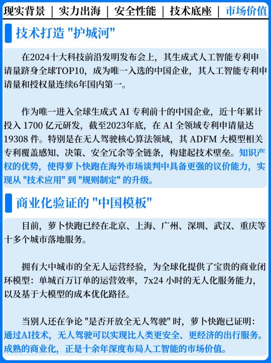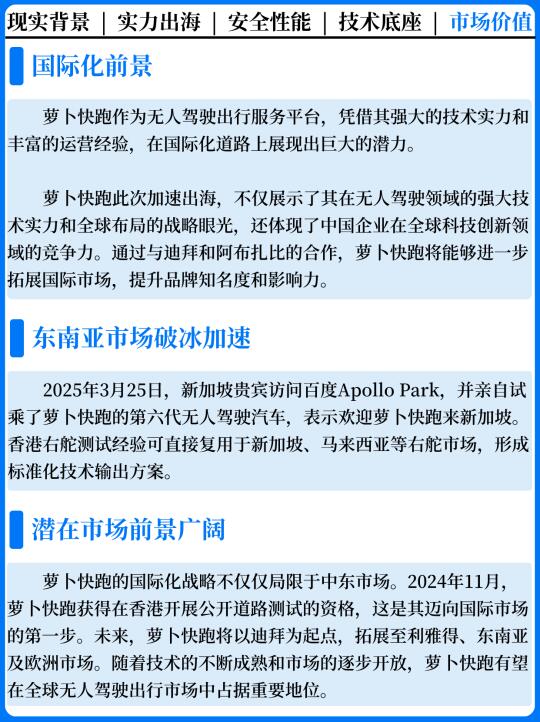 [拳头R] 随着全球市场的不断开拓,萝卜快跑有望在全球无人驾驶出行市场中“拔得头筹”,推动全球交通出行的智能化和绿色化发展。