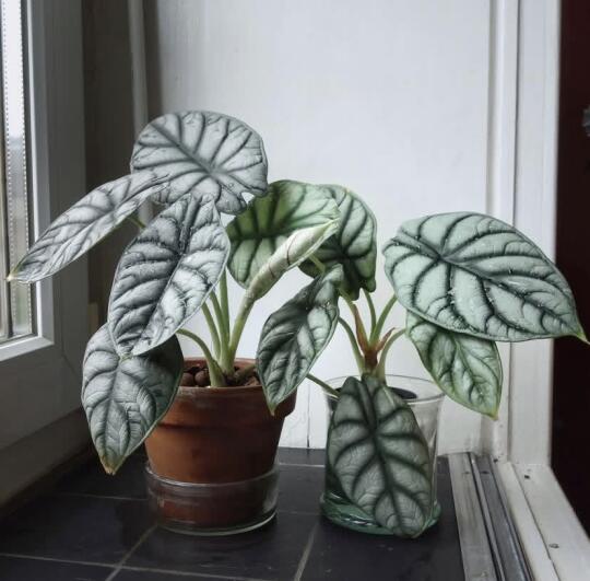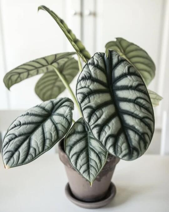 • 叶片:叶质厚实,呈盾形,银灰色的叶肉与墨绿色的叶脉形成鲜明对比,极具辨识度,叶片可达20厘米长、15厘米宽。