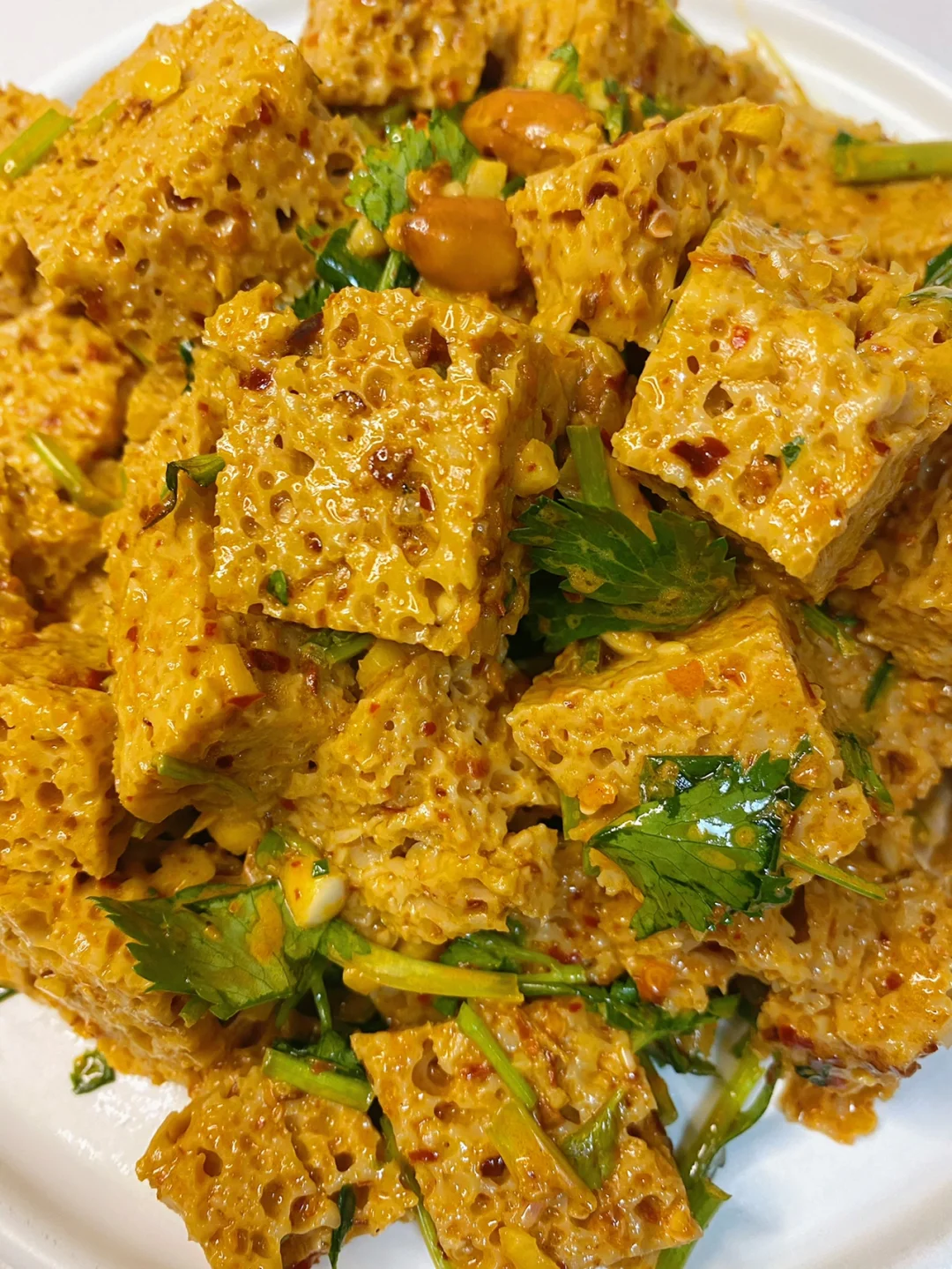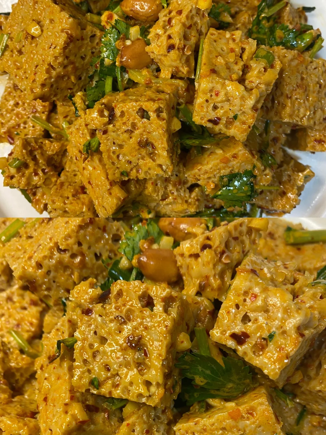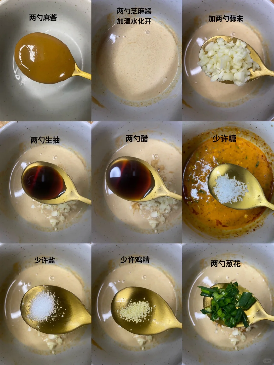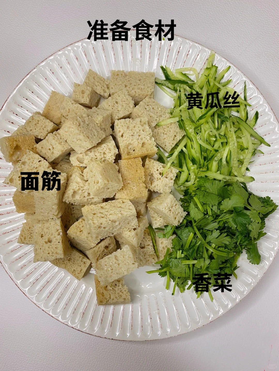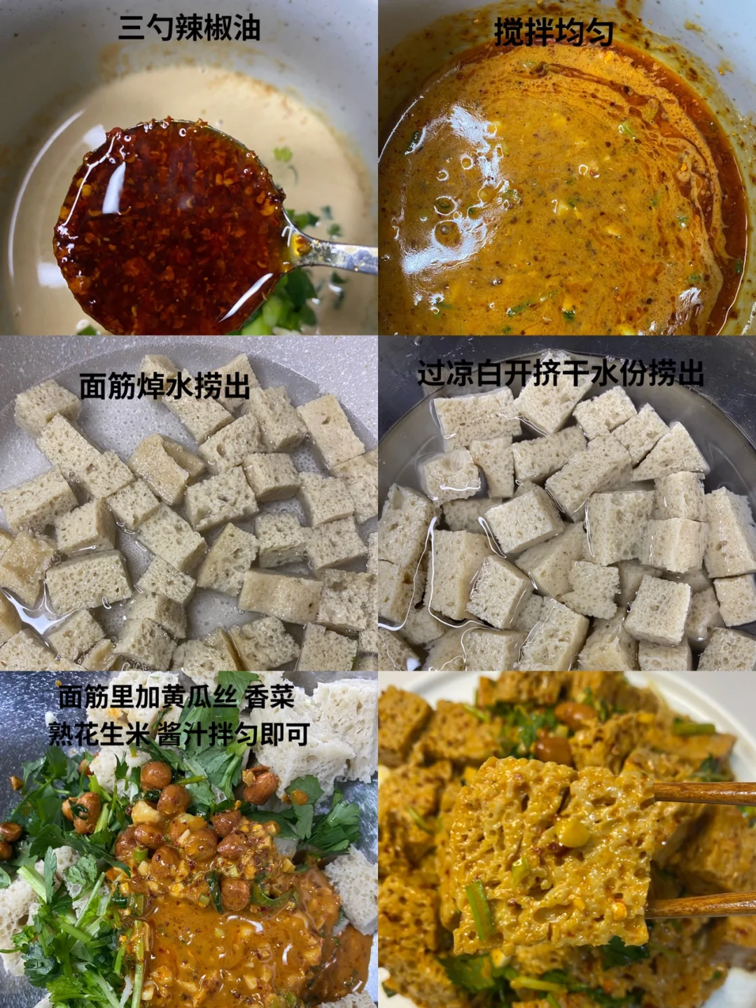 有没有人跟我一样每次吃凉皮的时候 里面的面筋都不够吃 今天自己动手在家做一盘 一次吃过瘾😋 食材: 面筋、黄瓜丝、香菜、蒜末、花生米 、小葱 做法: 1、碗里加入两勺芝麻酱用温开水化开➕两勺蒜末➕两勺生抽➕两勺醋➕少许糖➕少许盐➕少许鸡精➕两勺葱花➕三勺辣椒油 搅拌均匀备用 2、锅中水开入下面筋焯水捞出,捞出来的面筋过凉白开挤干水份 3、把面筋 黄瓜丝 香菜 花生米 酱料放一起拌匀即可