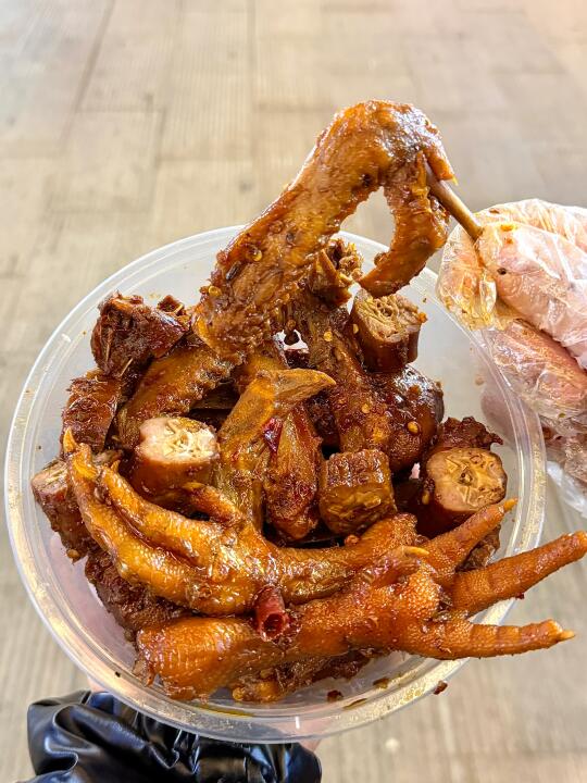 逛洪家楼夜市新发现的,是两个小年轻摆的摊 卤味都是自己每天现做的,种类还挺多的,吃起来是那种甜麻辣口感,越吃越入味 尤其是浇了汤汁后 更吼吃了!还有素菜!而且也不贵!个人觉得鸭翅贼吼吃!!