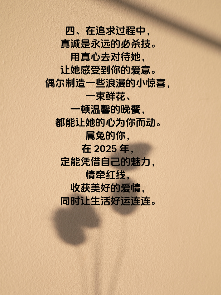 一、2025 年,对于属兔的人来说,似乎有着特别的情感预兆。情牵红线,意味着爱情可能会在这一年悄然降临。属兔的你,心思细腻,温柔善良,在追求爱情的道路上,这些特质就是你的闪光点。要善于运用它们,去吸引那个特别的人。 二、当遇到心仪的女生时,不要急于表白。先从朋友做起,慢慢了解她的喜好、兴趣。比如,如果她喜欢阅读,你可以和她分享最近读到的好书;如果她热爱运动,不妨陪她一起去跑步、打球。通过这些日常的互动,拉近彼此的距离。 三、而‘财落金盘好运连’也暗示着,在感情中经济基础同样重要。努力提升自己的事业,让自己有更稳定的收入。这样在与女生相处时,你能为她提供更好的生活,带她去看更美的风景,品尝更美味的食物。 四、在追求过程中,真诚是永远的必杀技。用真心去对待她,让她感受到你的爱意。偶尔制造一些浪漫的小惊喜,一束鲜花、一顿温馨的晚餐,都能让她的心为你而动。属兔的你,在 2025 年,定能凭借自己的魅力,情牵红线,收获美好的爱情,同时让生活好运连连。