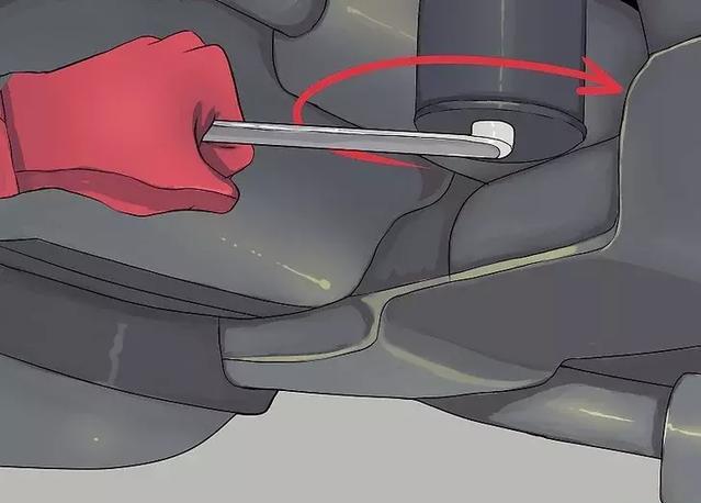 6小心地拧上新的、润滑好的机油滤清器。机油滤清器通常会说要拧多紧,所以在包装盒上的说明书上看更具体的说明。在一般情况下,你会拧紧过机油滤清器直到和垫片接触,然后再拧四分之一圈。