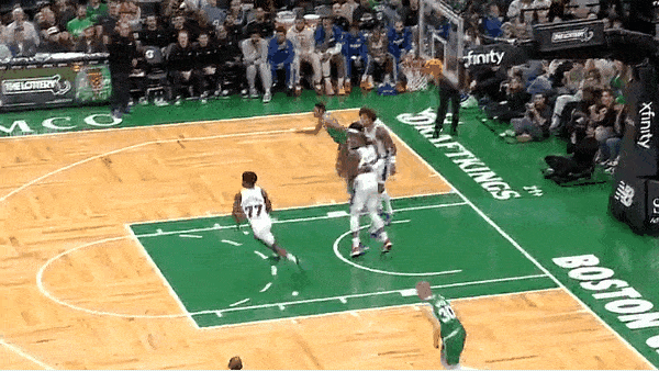 NBA常规赛,76人客场对阵凯尔特人的比赛正在进行中。比赛的第三节,埃奇库姆快攻送精准长传,助攻格兰姆斯轻松上篮得分。