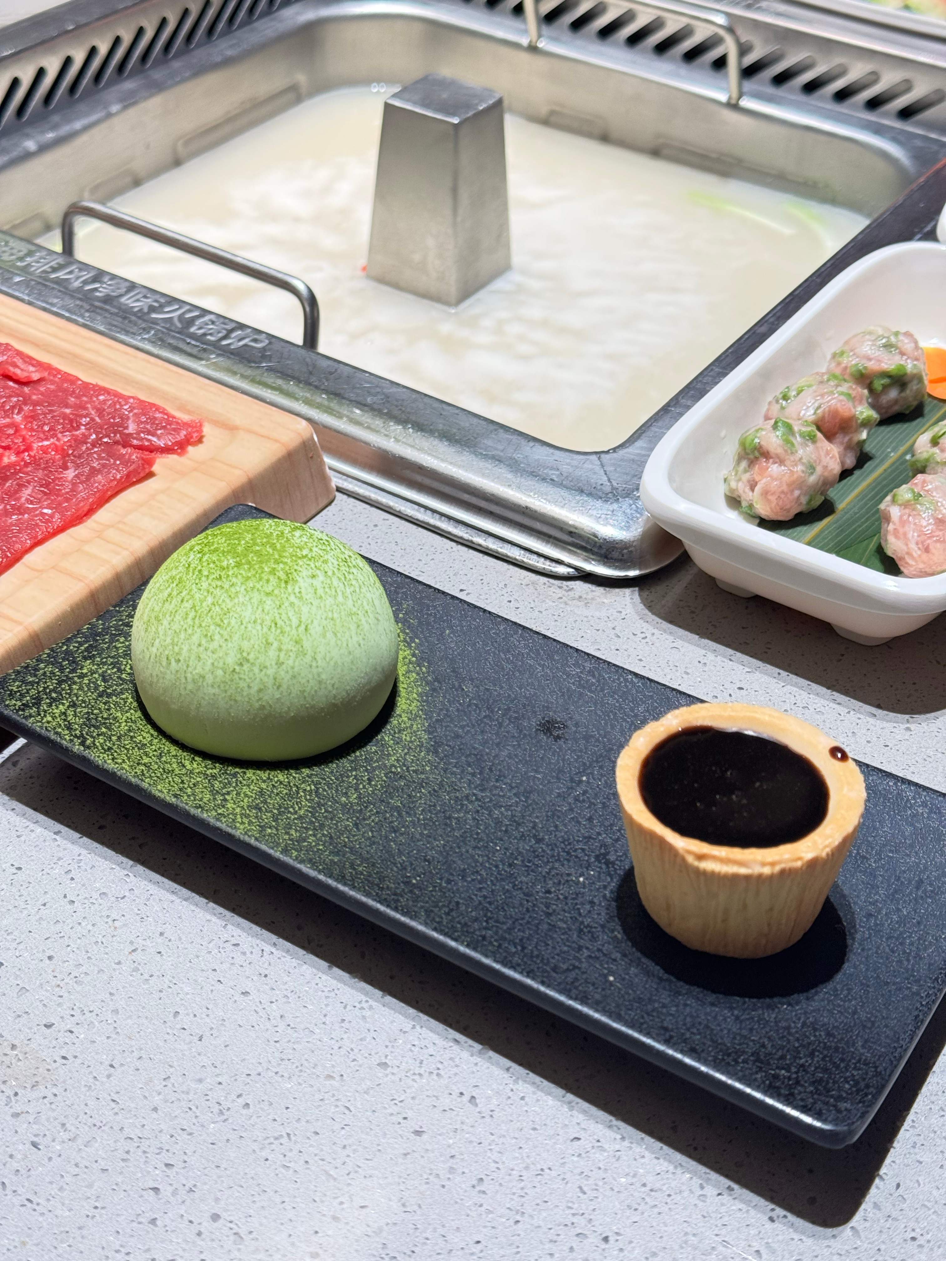 🍰抹茶提拉米苏切开像翡翠熔岩,微苦回甘配火锅竟然不违和。