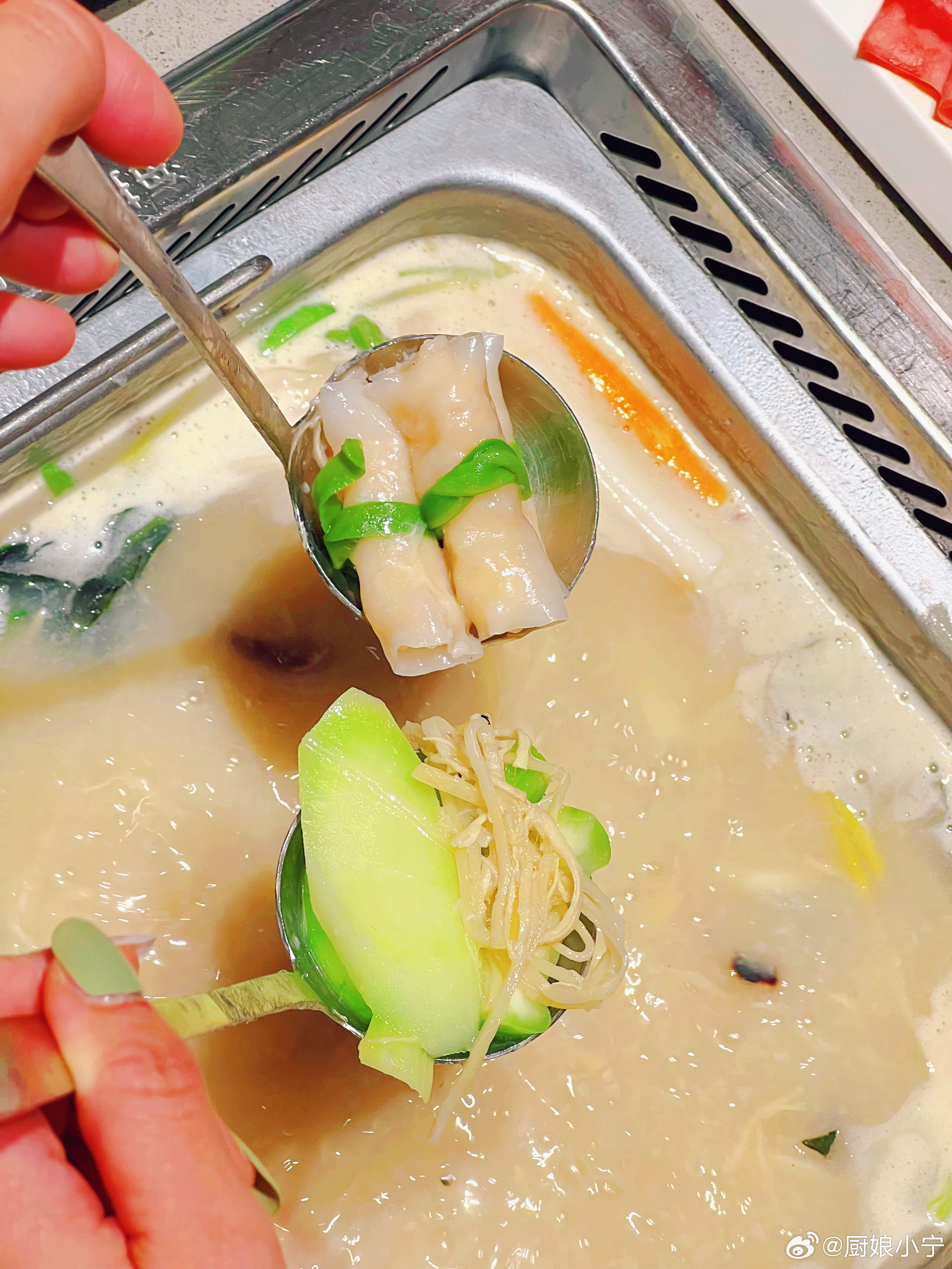 鱼皮和虾滑的组合着实惊艳,手工捶打的鱼肉做的皮酿上虾滑。煮过以后鱼皮变成了透明色,超有食欲,一口下去还有马蹄脆脆的口感超级好吃![憧憬]