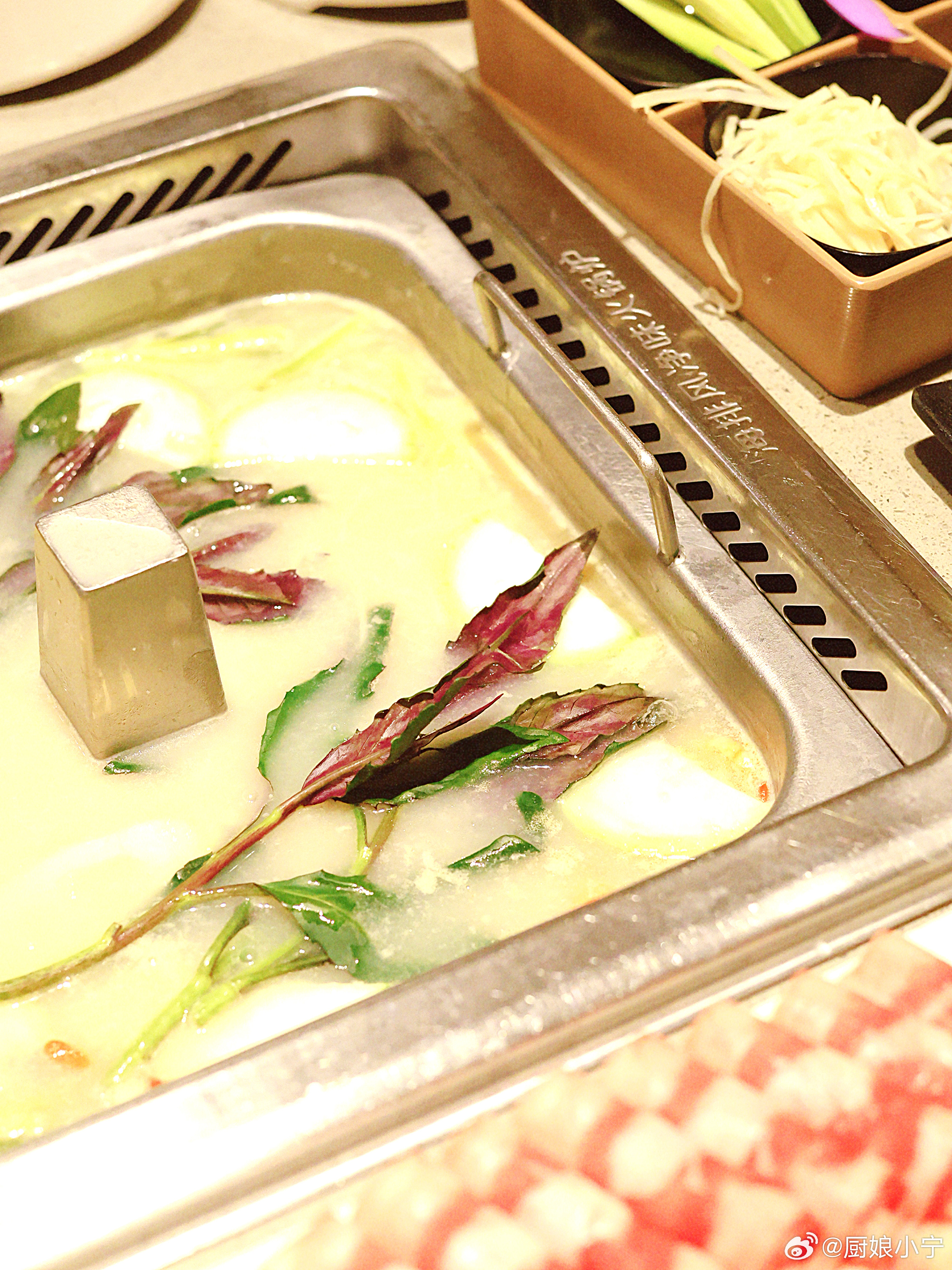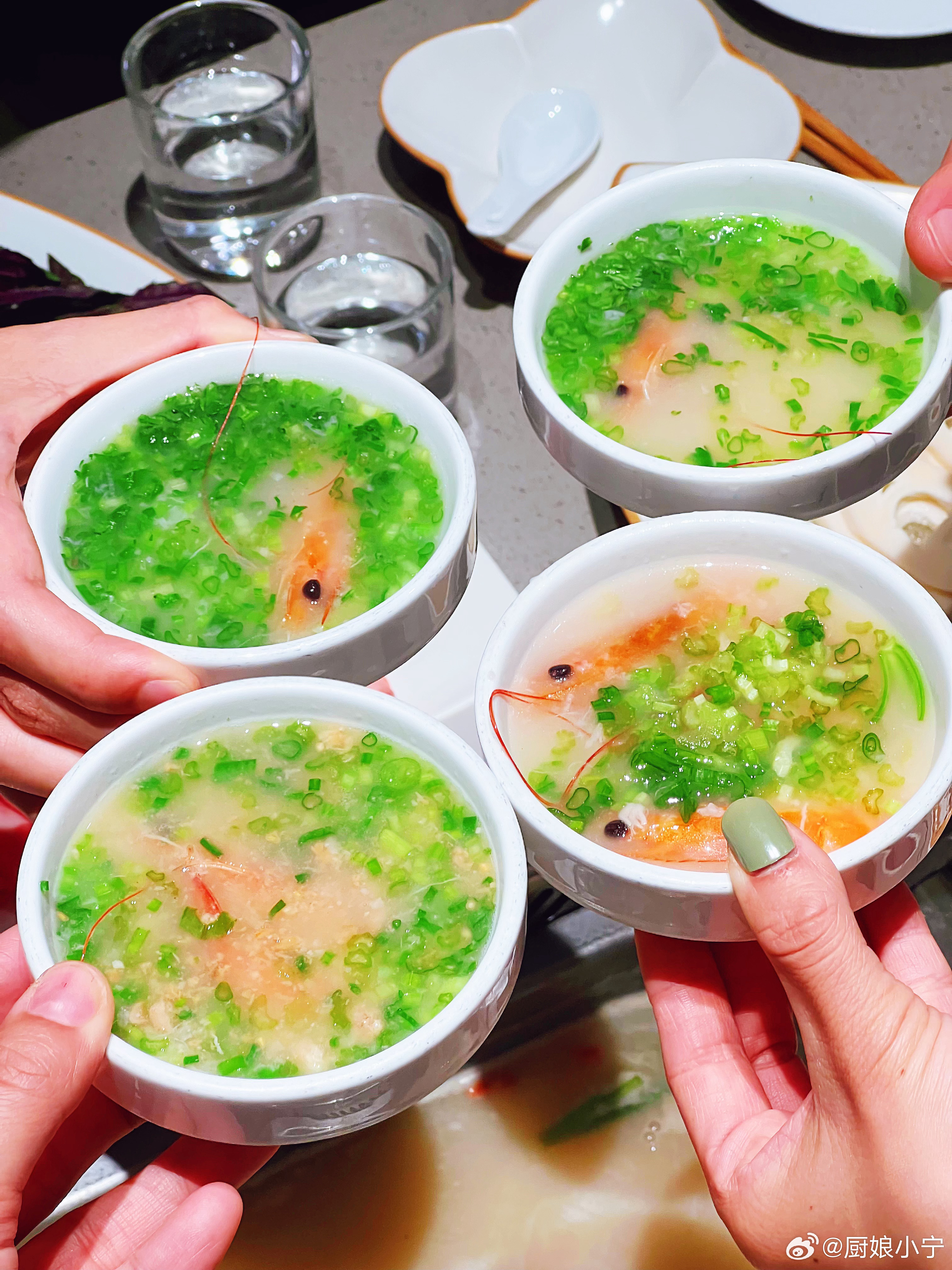 这可不是普通的白粥锅底!里面是南美白虾+干贝+鸡丝。鲜上加鲜,还没开始涮火锅就能喝它三大碗!😋
