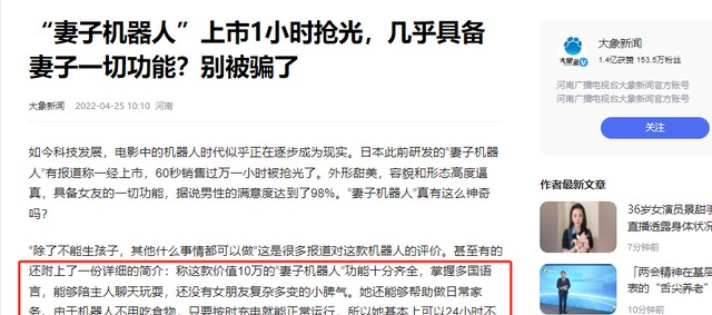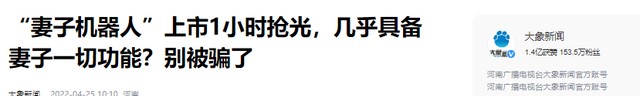 信息来源:大象新闻2022-4-25“妻子机器人”上市1小时抢光,几乎具备妻子一切功能?别被骗了