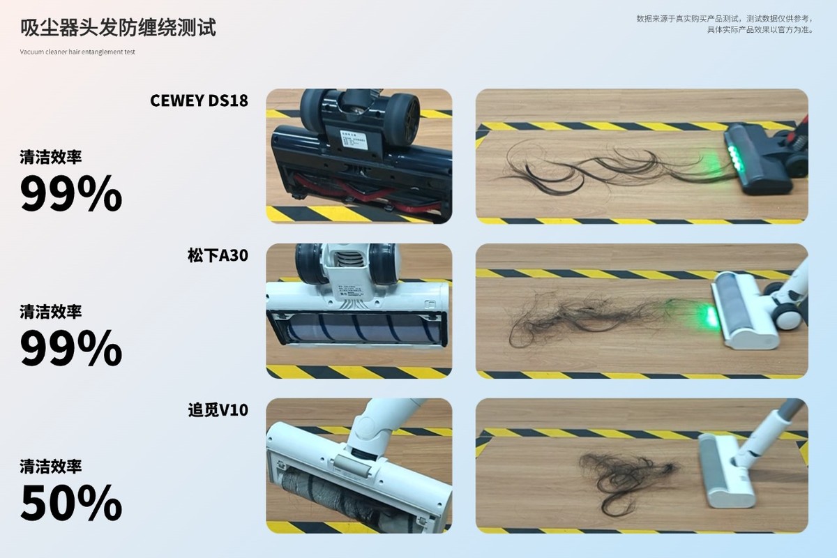 测试总结:防缠绕表现优秀:CEWEY防缠绕表现良好:松下防缠绕表现一般:追觅在毛发测试里,CEWEY DS18 的防缠绕 V 型复合滚刷结构确实管用,清扫完之后滚刷表面几乎没缠什么长发,后续基本不用额外清理,用起来特别轻松。松下吸长发时能搞定大部分,但刷头前端还沾着几根,清洁结束后得用手摘下来,不算麻烦但多了一步。追觅的缠绕问题就挺明显了,长发总缠在滚刷中间,每次都得清洁一段时间,要是家里经常要清理头发或宠物毛,用着会觉得有点费劲。
