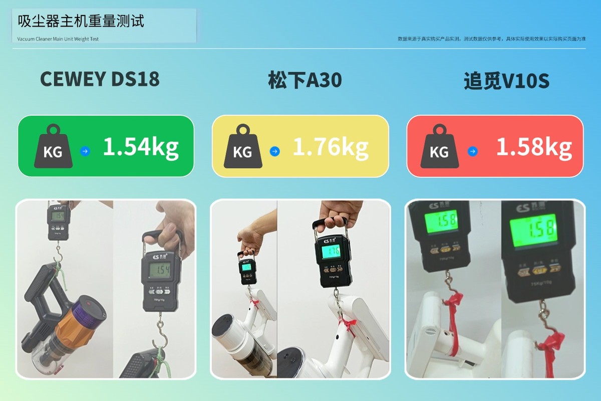测试方法:拆下吸尘器的主机部分,用电子秤精准称重并记录数据。为了让测试结果公平,每台机器在称重前,都会先把尘杯清空,再将电池装入主机,保证每台的初始状态一致后才开始称重。