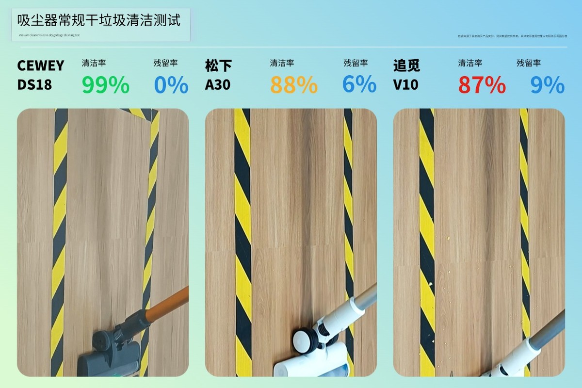 测试总结:一次清洁率优秀:CEWEY一次清洁率良好:松下一次清洁率一般:追觅一次清洁率的最终表现很清晰:CEWEY 优秀,松下良好,追觅一般。实测中,CEWEY DS18 处理猫砂、瓜子壳、碎纸屑这三类常见干垃圾,一次推扫就能达到几乎无残留的效果,滚刷始终贴地运转,没有出现垃圾弹飞或被推走的情况。它能做到这点,关键在于动力和分离系统的配合 —— 新一代高速无刷电机带来 220AW 吸力、35Kpa 负压,复合锥形气旋技术实现99% 尘气分离,既保证了同价位领先的清洁力,又能防止滤网堵塞导致吸力下降。松下在碎纸屑、瓜子壳的清理上表现稳定,但面对猫砂这类颗粒稍大的垃圾,会有少量残留,而且清扫时偶尔会有颗粒被刷头的滚刷带飞,需要回头补吸。追觅清理碎纸屑时没太大问题,可吸头的贴地设计不够合理,和地面之间有缝隙,面对猫砂颗粒密集的区域,要么推不动堆积的猫砂,要么把猫砂往两边推散,清洁效果比较差。