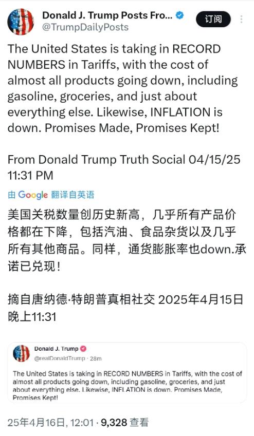 特朗普今天(北京时间4月16日)写道:“美国正在征收创纪录的关税,几乎所有产品的价格都在下降,包括汽油、杂货和几乎所有其他产品。同样,通货膨胀也在下降。承诺已兑现。” 经济学彻底不存在了吗?征收关税能够让物价下降,什么智商的川粉能信这话?从现实情况来看,关税的增加往往会提高进口商品的成本,进而传导至国内物价,导致通货膨胀上升。