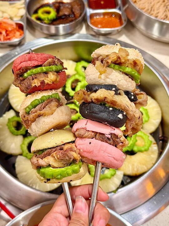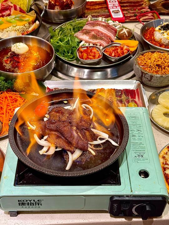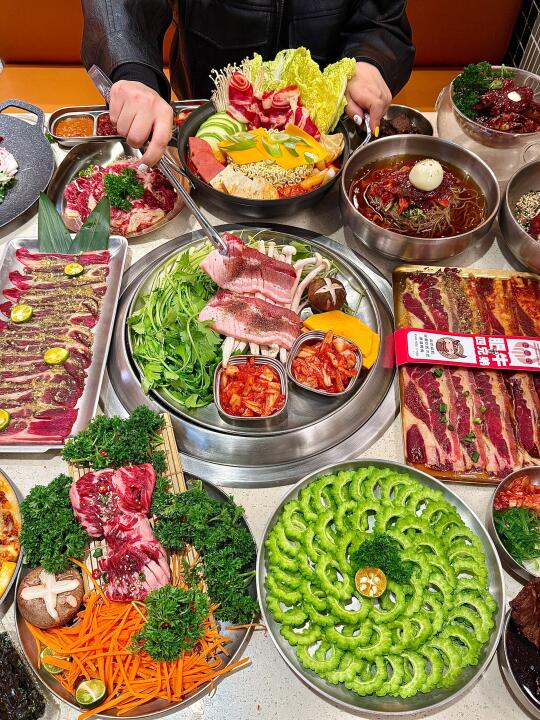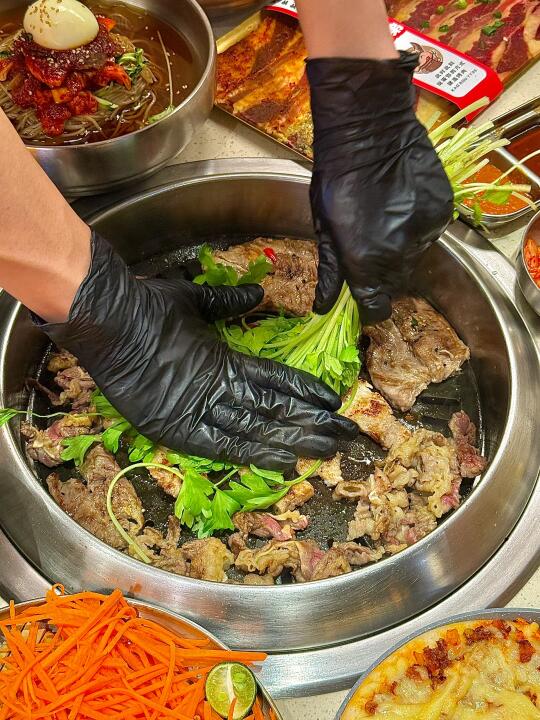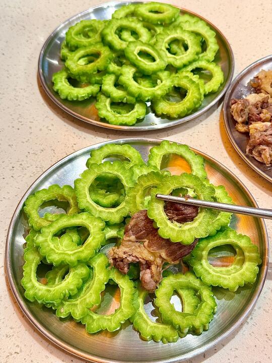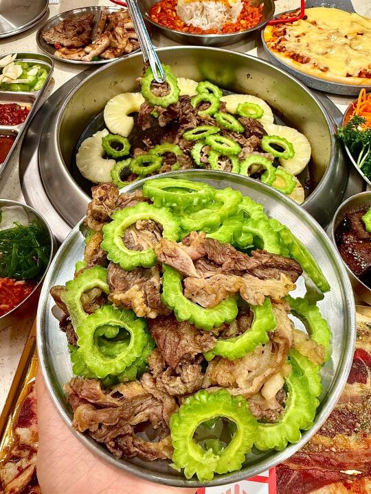 没想到济南也有苦瓜烤肉了!!苦瓜挺清脆的 可以解腻 而且还有了甜醋酱 可以蘸着吃!! 水芹菜五花肉也是第一次吃