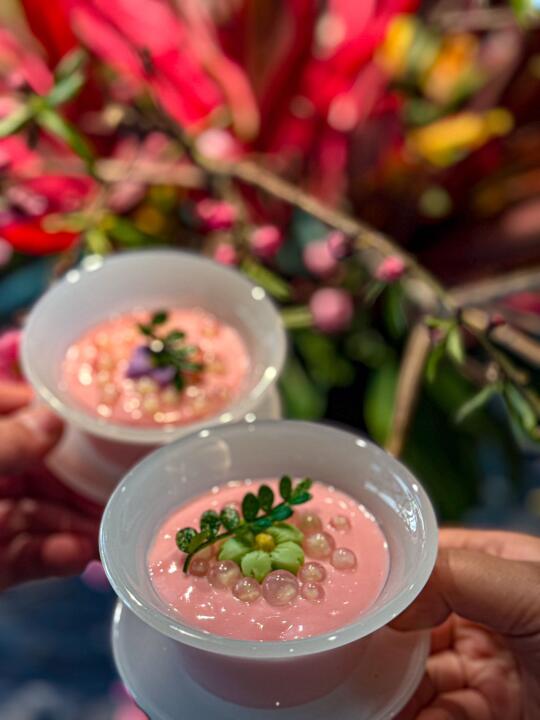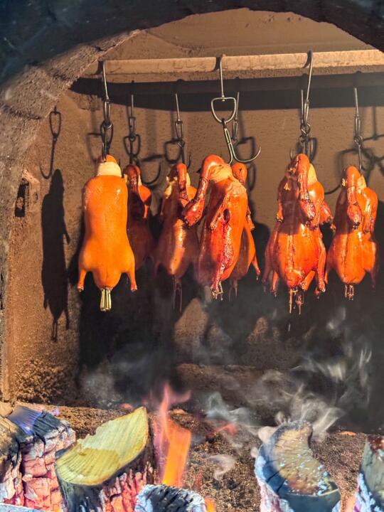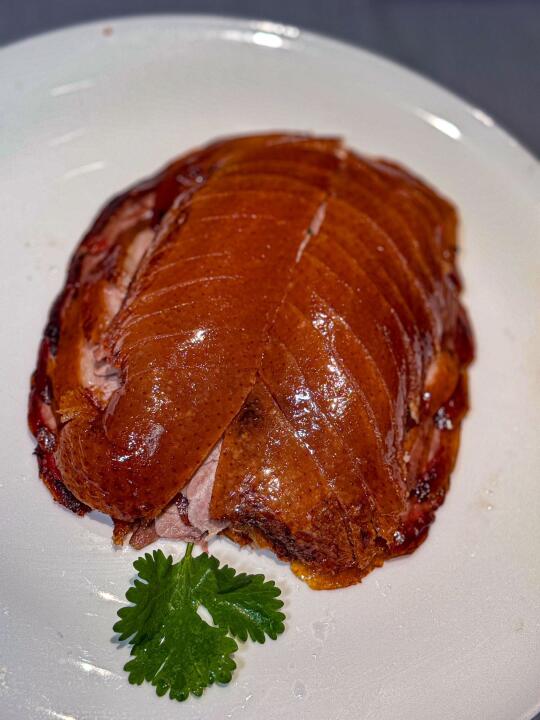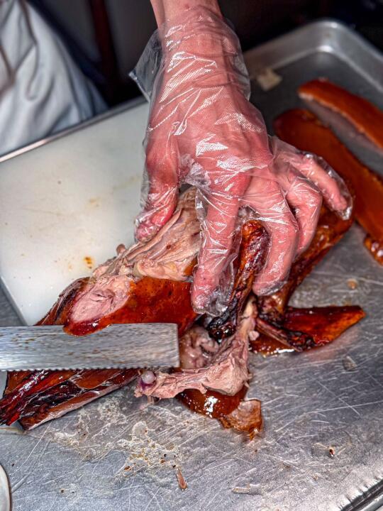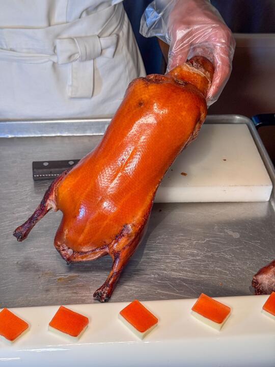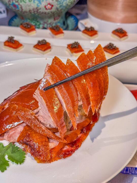 鱼子酱烤鸭更是惊艳。色泽诱人,外皮酥脆金黄,鸭肉鲜嫩多汁。师傅现场切片,动作娴熟。用轻薄的鸭饼裹上鸭肉,再搭配上酱料与葱丝,放入口中,果木的独特清香瞬间散开。